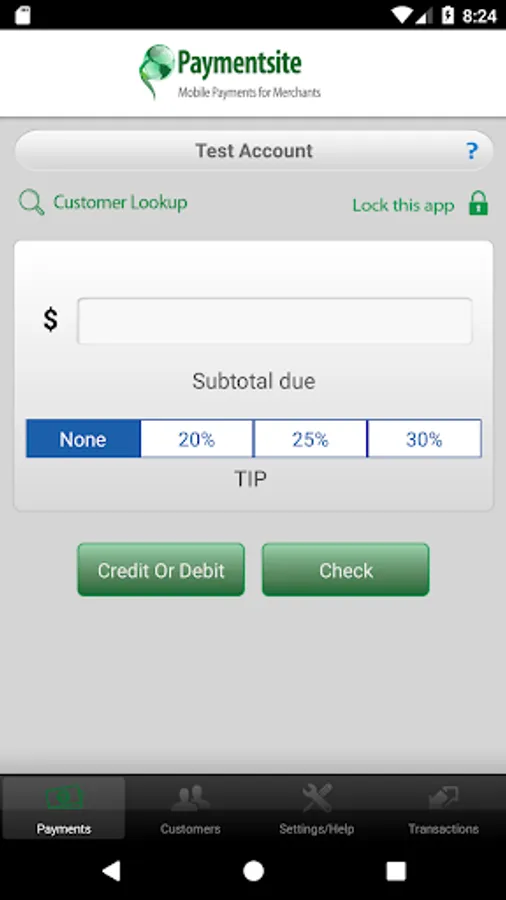 Paymentsite Mobile enables businesses to instantly process credit card, debit card and check payments from their customers directly from their Android device. The Mobile app works seamlessly with our Cloud based software to manage all your business payment processing needs. Take this anywhere you can get cell or WiFi access to process payments into your account.