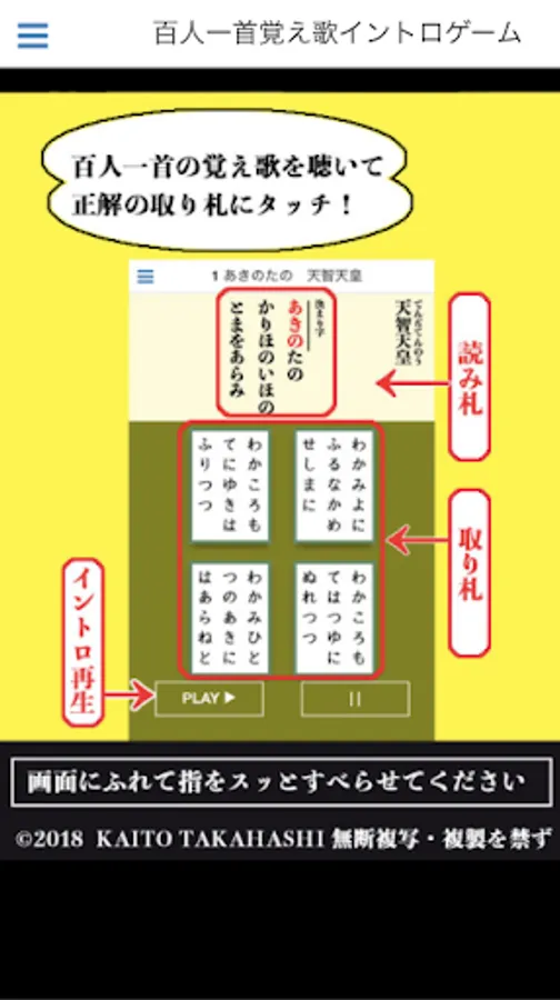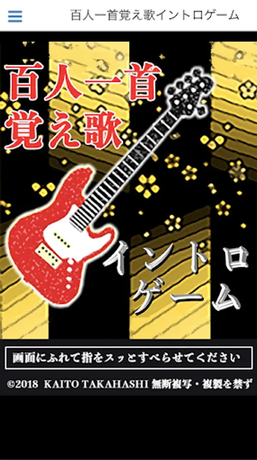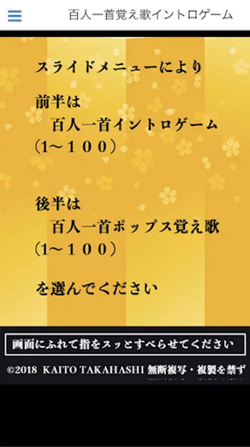 ◆ The first half of the app is the intro game corner. ◆ The reading tags for the above phrases are selected from the menu in the fixed order. ◆ The correct answer is selected from the four easy-to-make mistakes. If the answer is correct, a popping sound will come out, and if it is incorrect, a clapper and a clapping tree will be heard and a cross will come out. Because it is composed of only songs from the prelude of the sister app "Pops Obue Uta Hundred People", you can quickly learn 100 songs from 100 songs.