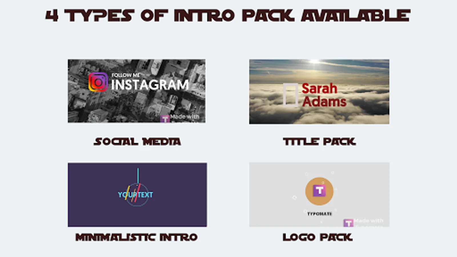 Introducing TypoMate - the ultimate intro maker app for creating professional and eye-catching video intros. With our user-friendly app, you can easily create stunning intros for your videos in just minutes. Choose from a variety of customizable templates, add your own text, and select from a wide range of typography styles and animations. Our app also allows you to add your own logo and music to personalize your intro even more. Perfect for vloggers, content creators, and businesses, TypoMate will help you make a lasting impression on your viewers. Download now and start creating unique and engaging video intros today.