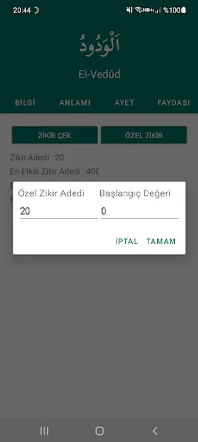 - With the special Dhikr feature, you can enter the number of dhikr you want and / or start dhikr from anywhere you want with an initial value.