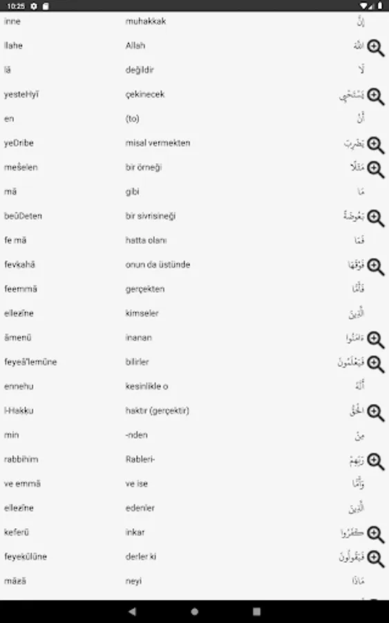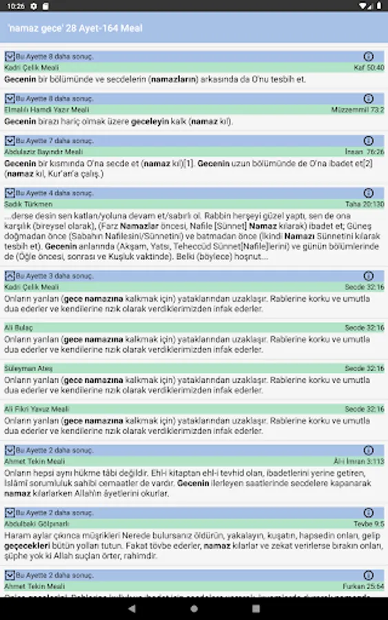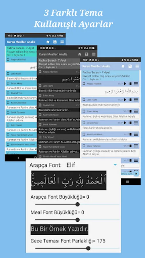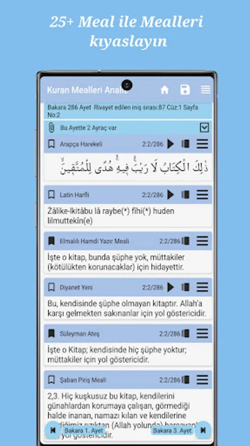 Arabic Original Quran, Latin Recitation and one in English 25+ Quran Meal: Ertan Aktaş, Abdulaziz Bayındır (Süleymaniye Foundation Means), Elmalılı Hamdi Yazır, Yaşar Nuri Öztürk, Süleyman Ateş, Kadri Çelik, Edip Yüksel, Mustafa İslamoğlu , Diyanet Meal, Bayraktar Bayraklı, Sadık Turkmen and other Authors of the Quran Meal.
