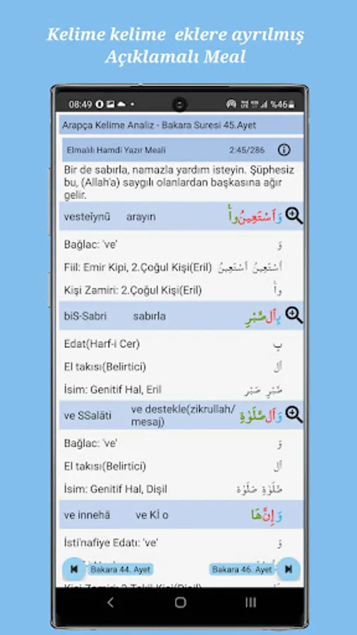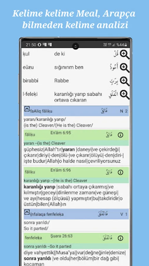 Compare, take notes, read, make hatim, search for translations and root words in the Quran with the Quran Meal Analysis Program.