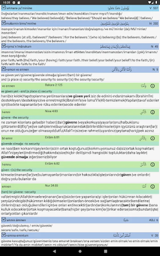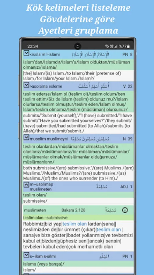 Advanced Meal Search: Listing all the translations of the Quran where the entered words match (whether it occurs at the beginning or the end of the meal, the word finds an additional word). The verses where the words are mentioned; to be able to categorize on the basis of root and stem words, to go to the meaning of that verse