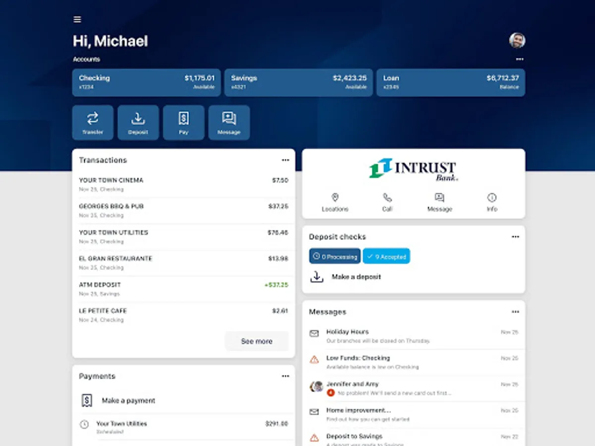 View and manage your accounts and transactions – View your INTRUST checking, savings, time deposit, and loan accounts in one convenient location. Monitor balances, search through recent transactions, view statements, create alerts, and order checks. Add custom tags and upload images to individual transactions to help keep you organized.
