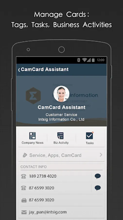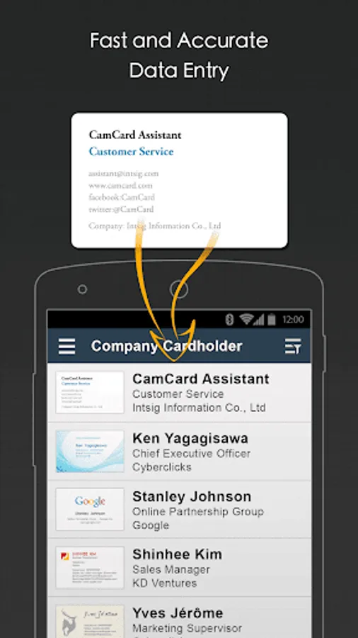 CamCard Business is a centralize business card database management solution for any scales of businesses, trusted by 200,000 companies. Implementing world’s cutting-edge character recognition technology, it boosts companies’ work productivity by cutting data-entry time and optimizing team collaboration.