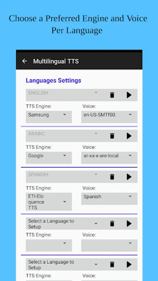 You can also choose the preferred TTS Engine and Voice per language, and of course you can control the speech speed and pitch.
