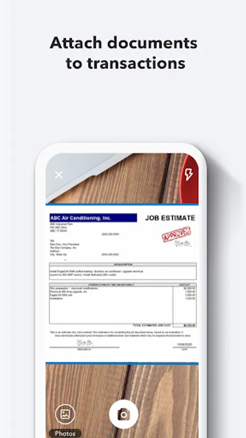 Save time with receipt and bill capture to automate entries. No more lost receipts or time-consuming expense reports! Easily attach documents to transactions.