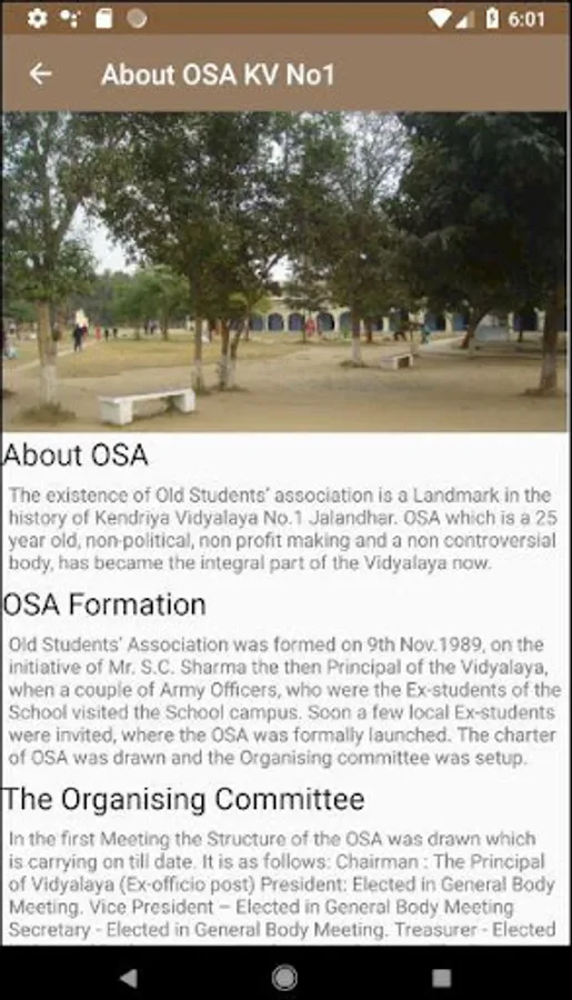 This app is created for Old Students of Kendriya Vidyalaya No. 1 Jalandhar Cantt, Punjab, India.The alumni member can get Announcement , view details about the upcoming events , view event photos etc. The main function is an address book where details about the alumni members can be viewed. Alumini can also register himself on App.
