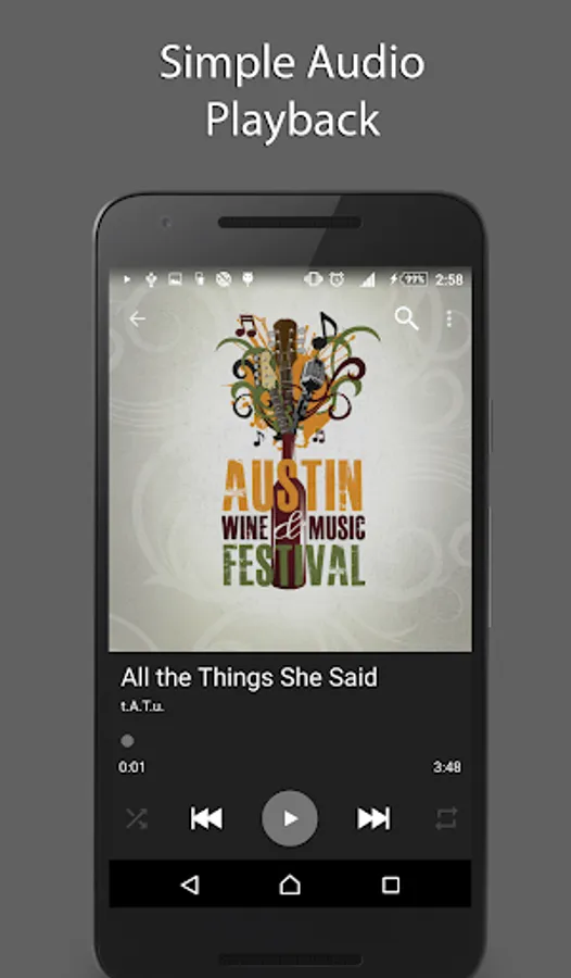 folders, genres, repeat music, shuffle music, notification bar audio controller and much more!