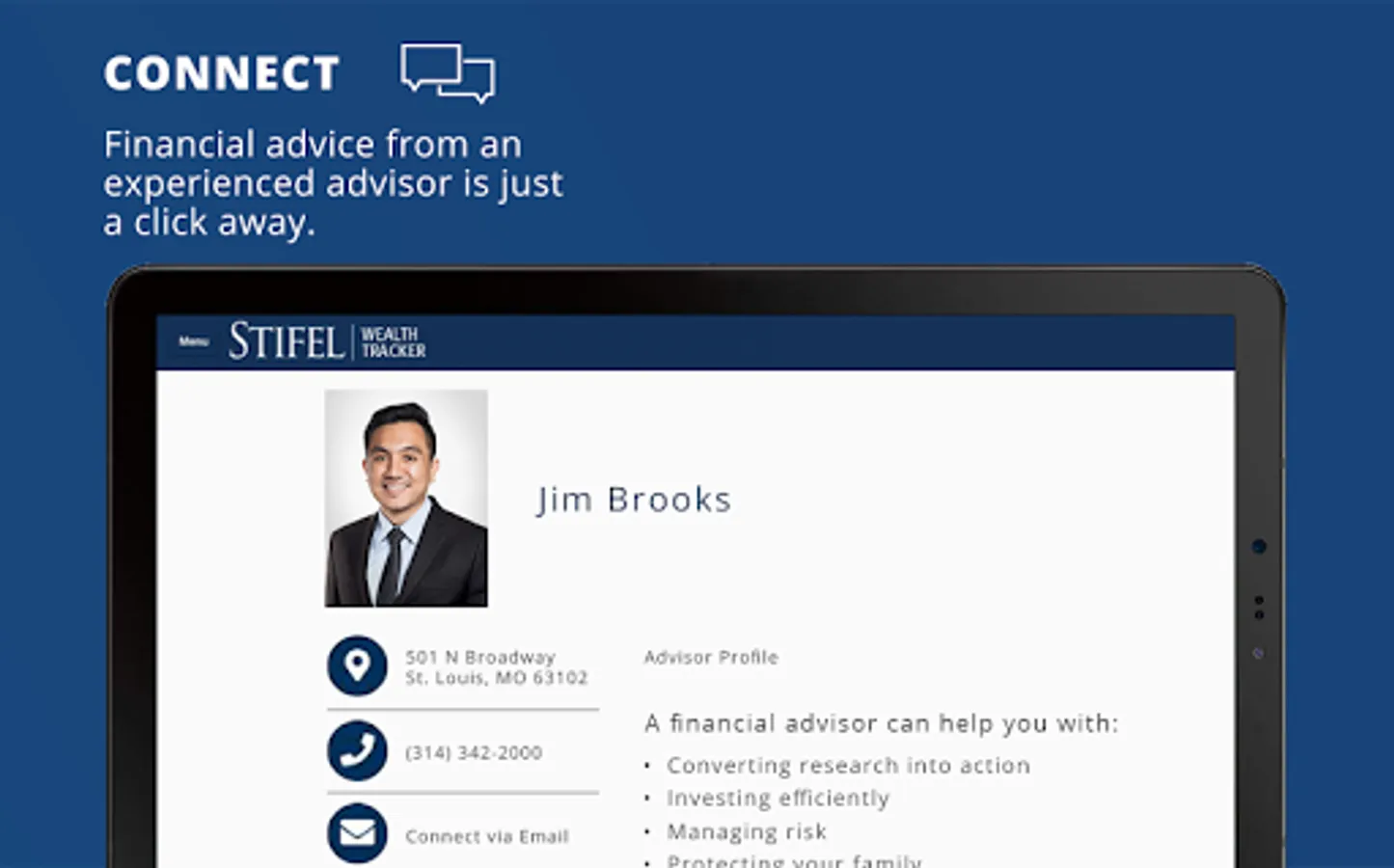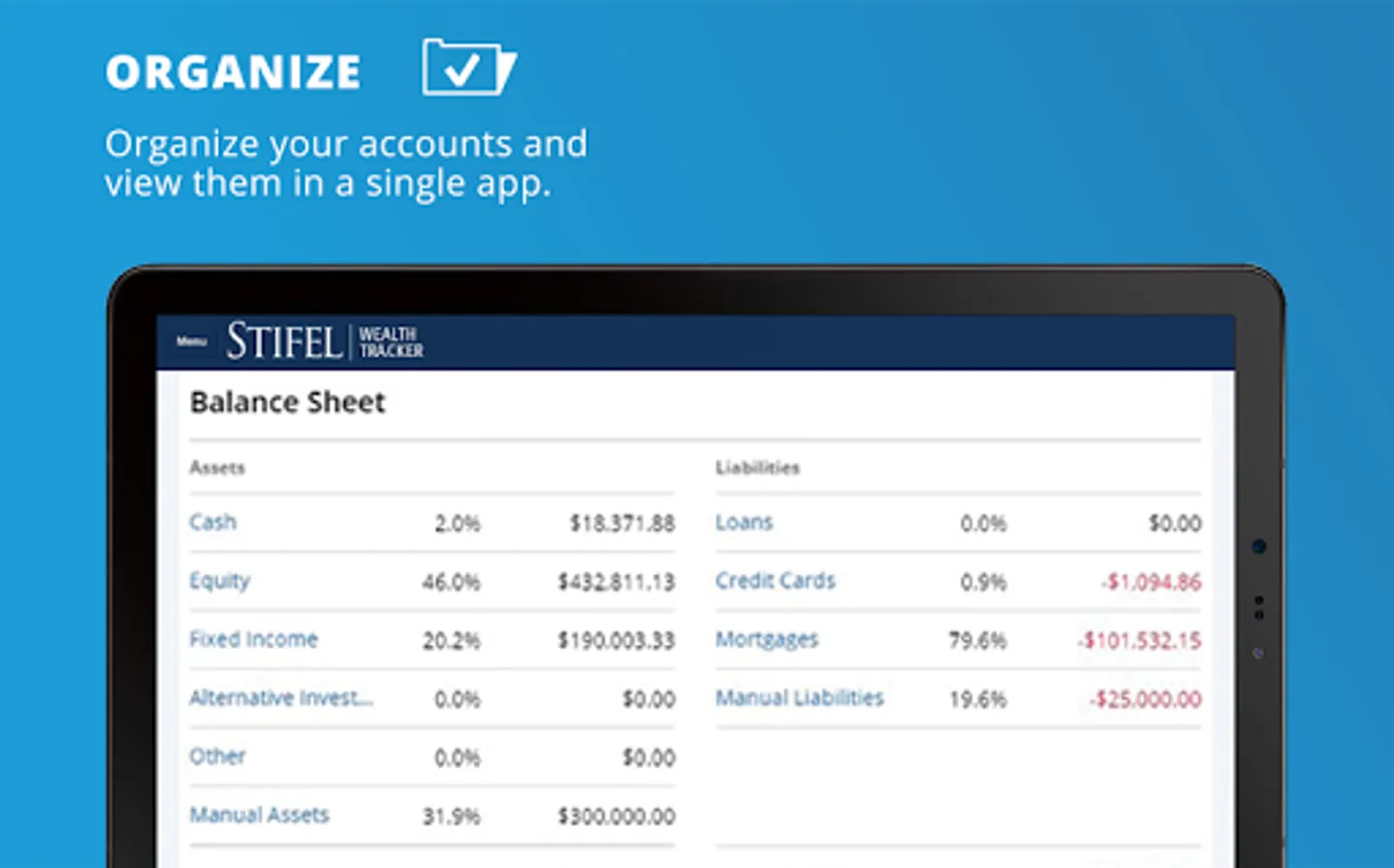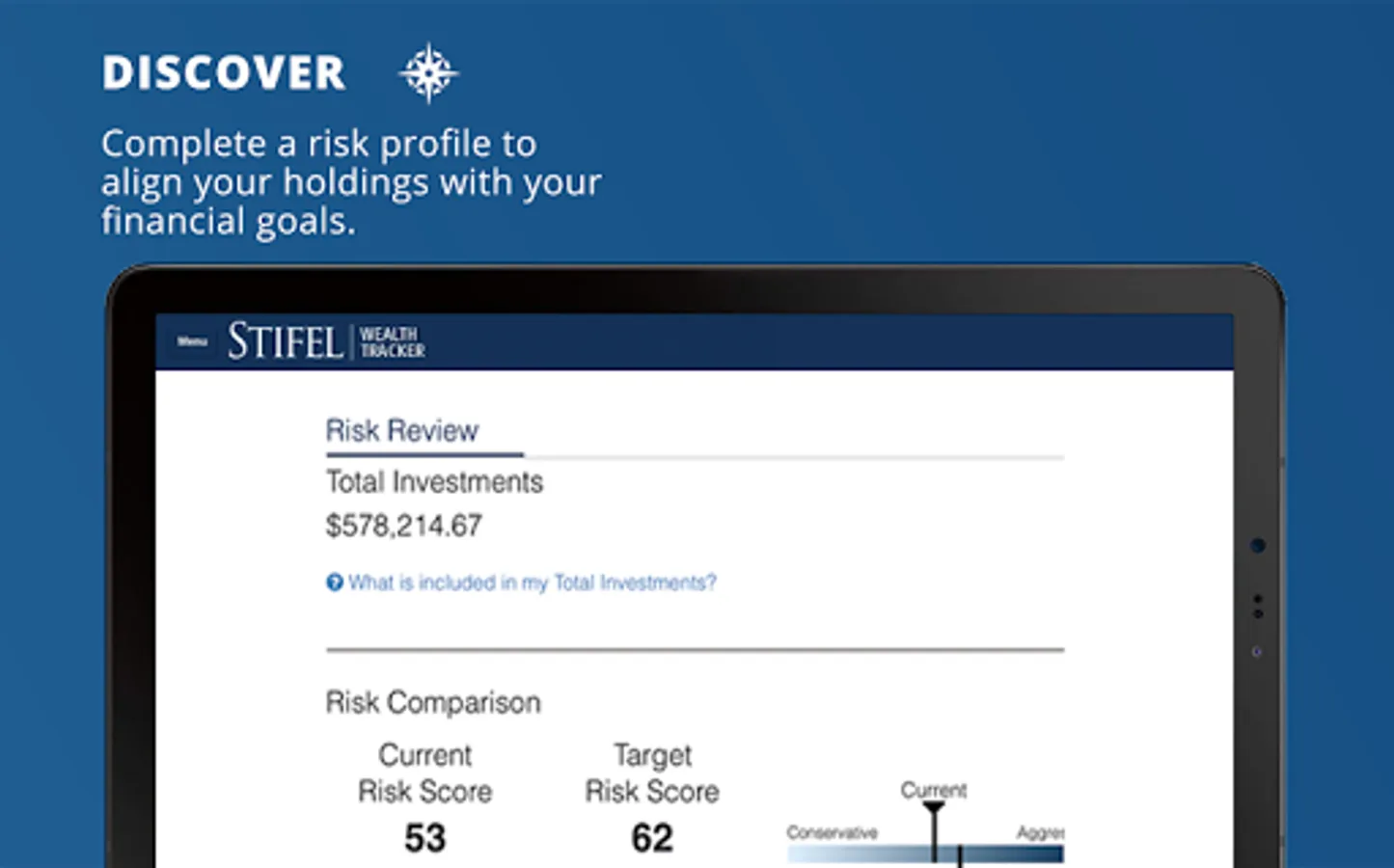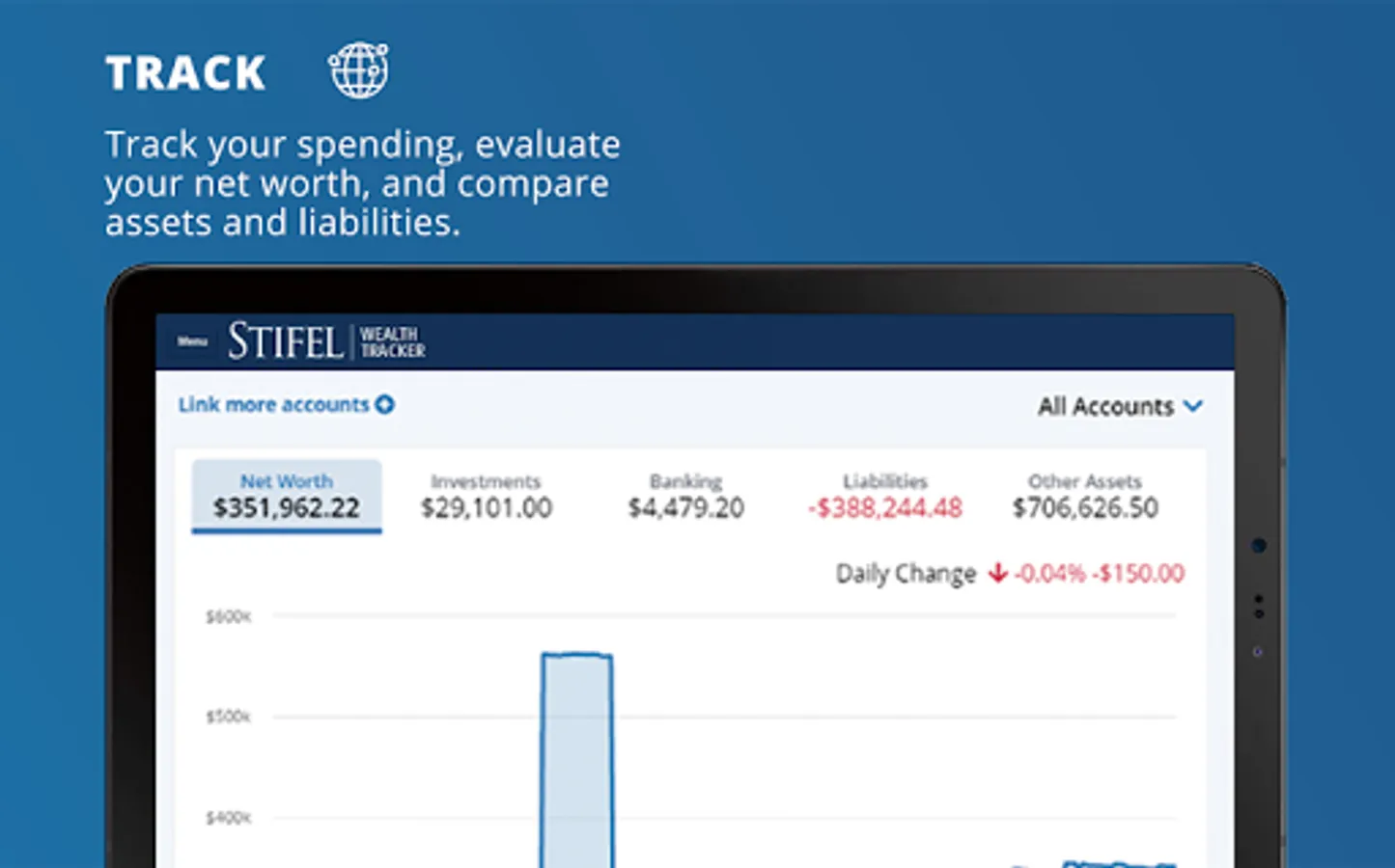 Available via mobile, tablet, or any computer, Stifel Wealth Tracker is a powerful free service designed to give you a big-picture view of your financial situation so that you can chart a course for your future. Use Wealth Tracker to securely view all of your financial information – your investment and retirement accounts, checking and savings accounts, mortgage, student loans and other loans, credit cards, and more – in one place. The software will track your net worth, monitor your progress toward your goals, perform detailed analysis on your investment portfolio and illustrate your asset and sector allocations. When you register for Wealth Tracker, you can complete a risk profile and see if your holdings are aligned with your financial goals, tolerance for risk, and time horizon. Additionally, the application can help you better understand certain investments through access to research reports from our nationally recognized equity research partner. Best of all, as an Wealth Tracker user, personal service is only a click away - whenever you have questions or need assistance, Wealth Tracker can connect you to a Financial Advisor in your area.