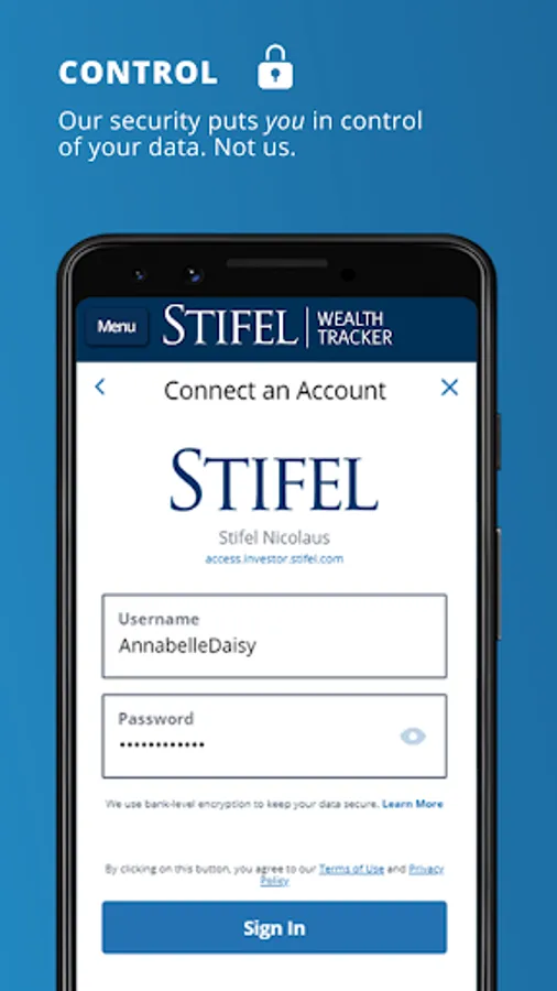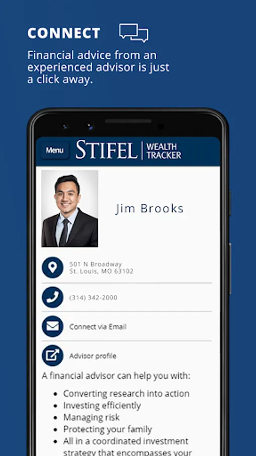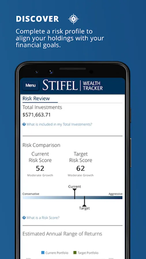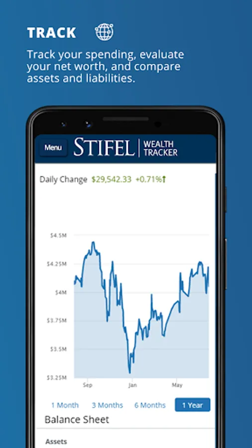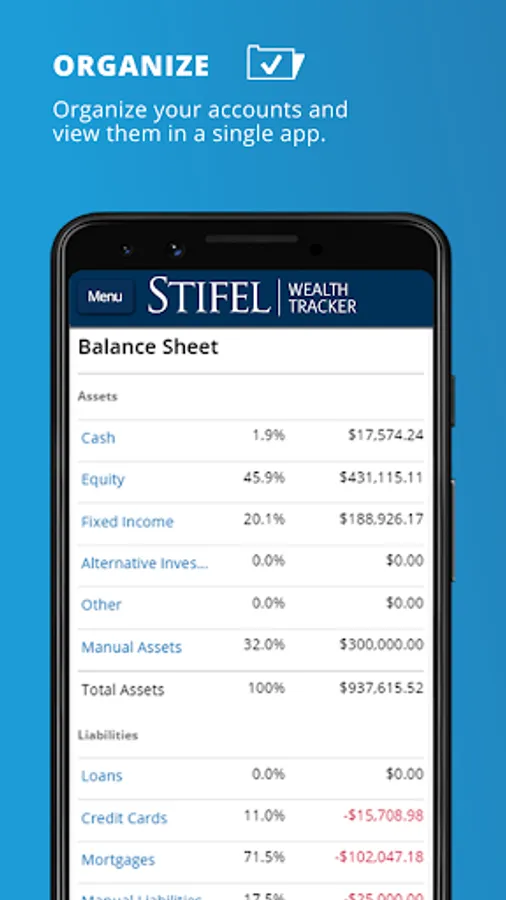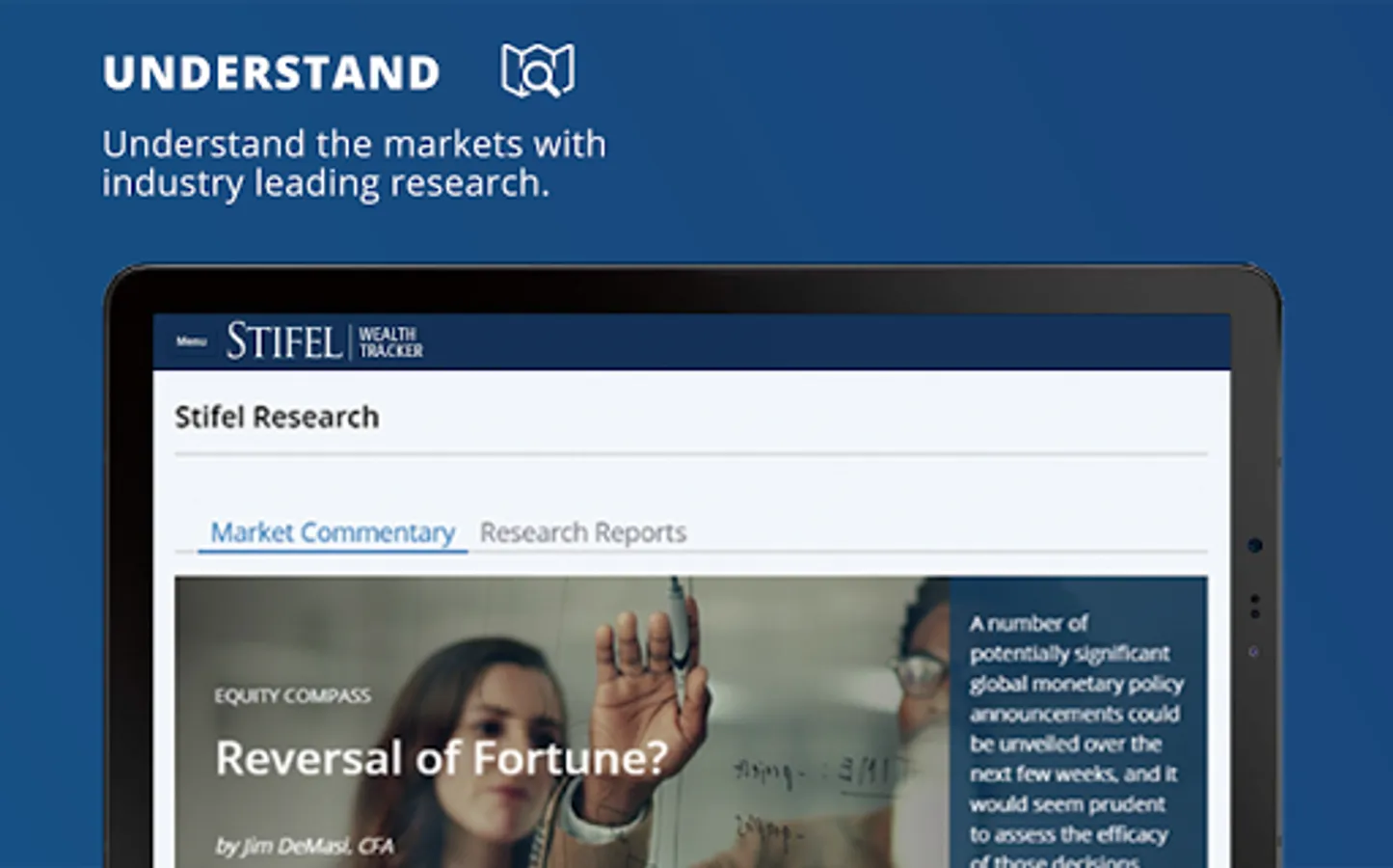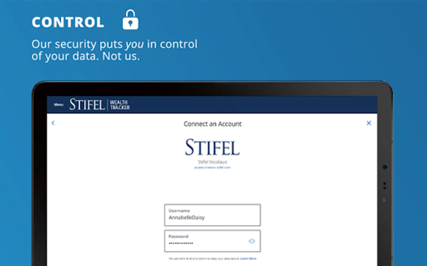 Available via mobile, tablet, or any computer, Stifel Wealth Tracker is a powerful free service designed to give you a big-picture view of your financial situation so that you can chart a course for your future. Use Wealth Tracker to securely view all of your financial information – your investment and retirement accounts, checking and savings accounts, mortgage, student loans and other loans, credit cards, and more – in one place. The software will track your net worth, monitor your progress toward your goals, perform detailed analysis on your investment portfolio and illustrate your asset and sector allocations. When you register for Wealth Tracker, you can complete a risk profile and see if your holdings are aligned with your financial goals, tolerance for risk, and time horizon. Additionally, the application can help you better understand certain investments through access to research reports from our nationally recognized equity research partner. Best of all, as an Wealth Tracker user, personal service is only a click away - whenever you have questions or need assistance, Wealth Tracker can connect you to a Financial Advisor in your area.