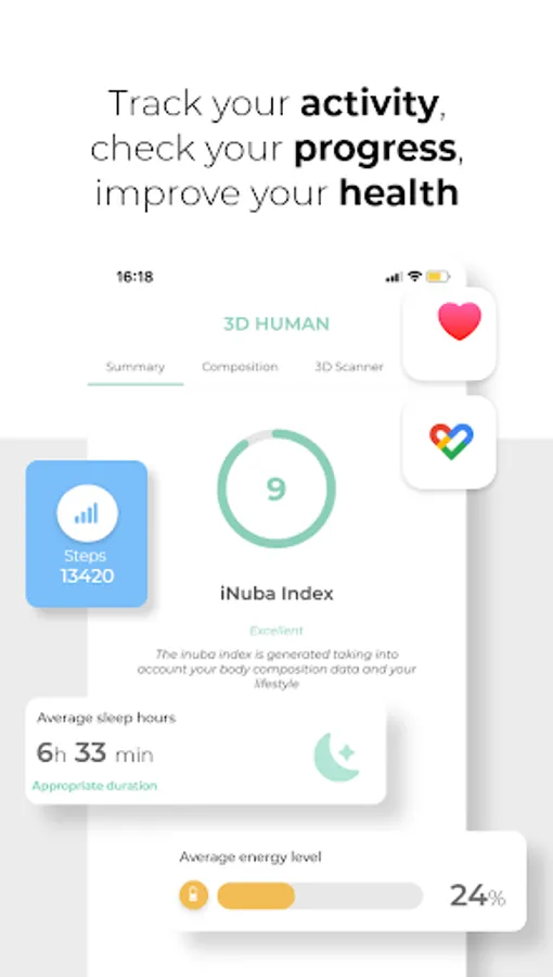With iNuba, you can easily and accurately monitor your health and have a more comprehensive view of your well-being. You can manually record activity, hydration, sleep, stress, and more or connect your device to import them automatically.