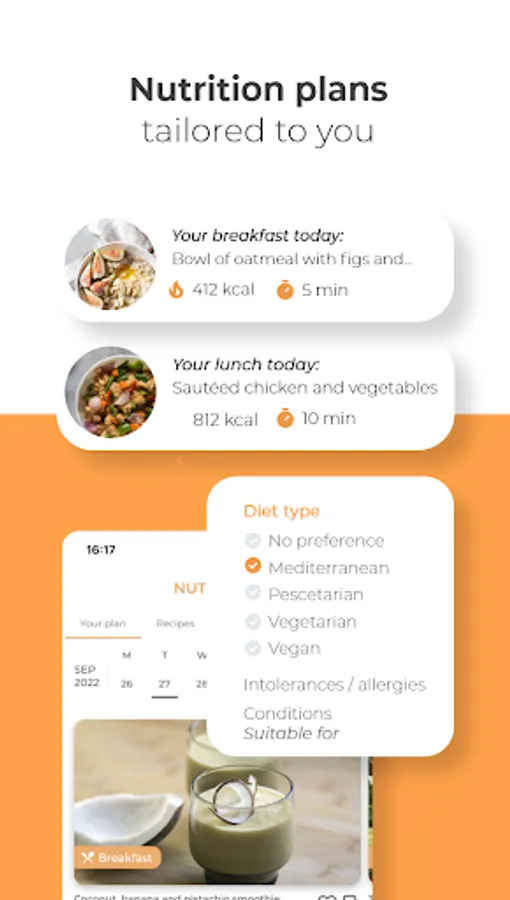 Custom nutrition plans based on specific goals. Lose weight, gain muscle, or simply eat healthily. Change dishes as many times as you want among +6,000 recipes, and all the recipes will be recalculated to maintain their nutrients and calories.