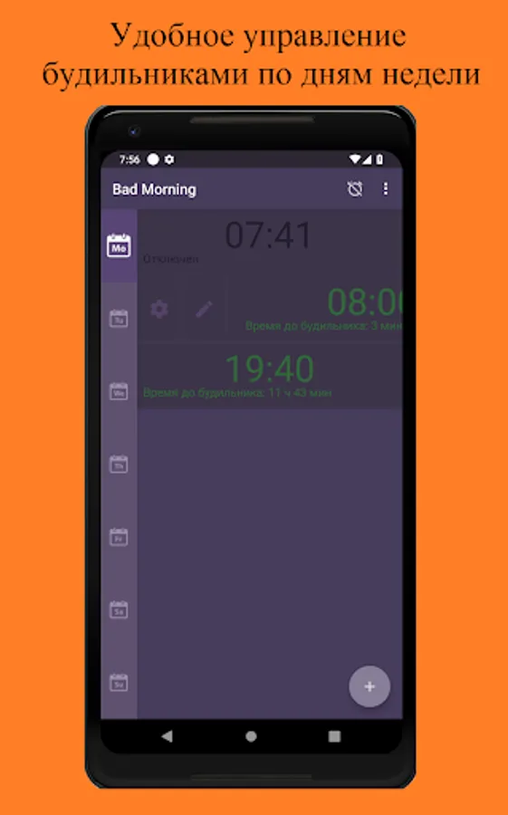 Every day you set alarm clocks for different times, there are a lot of them and you get confused about them? BadMorning allows you to conveniently distribute them by day and manage the whole day.