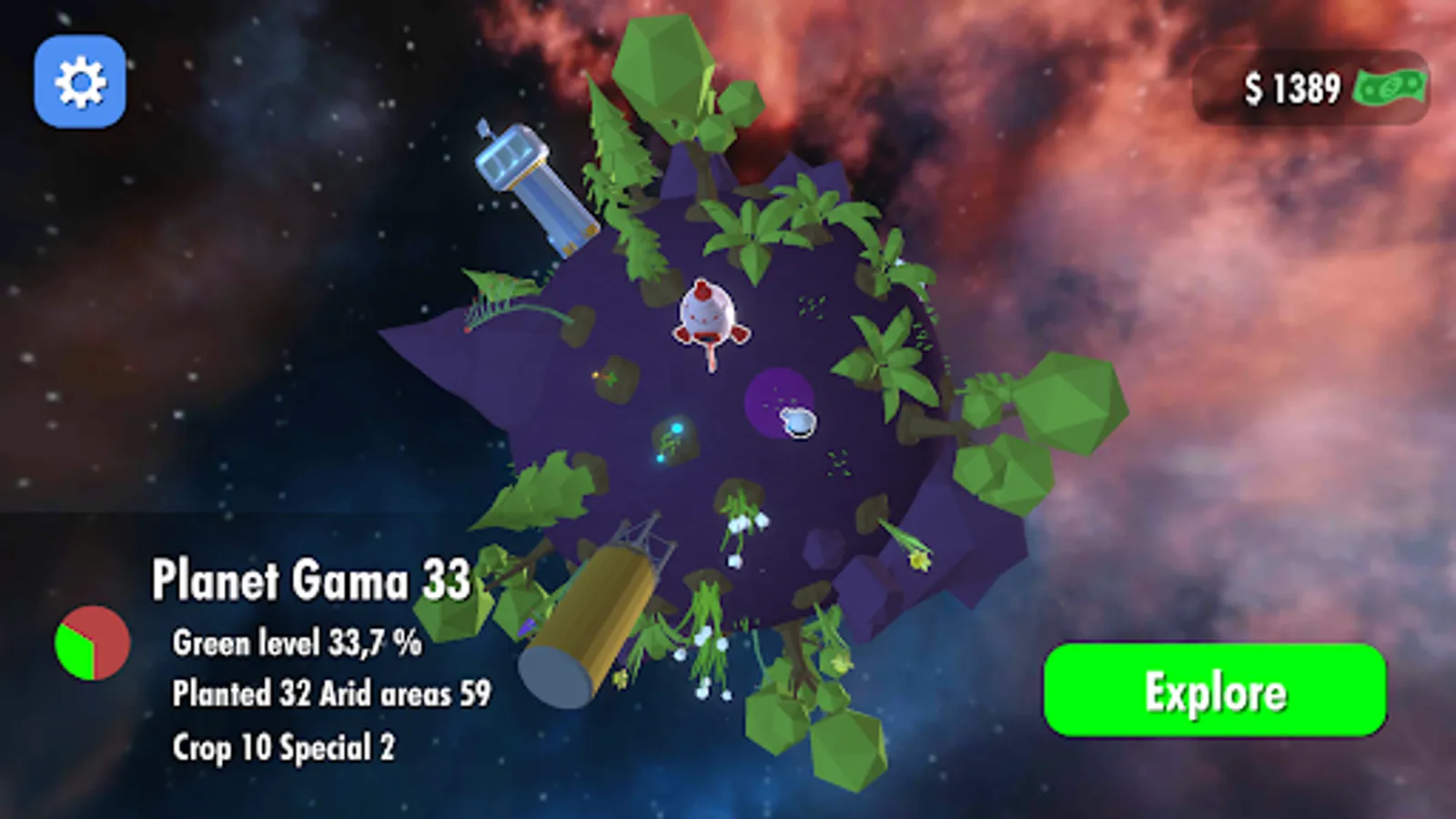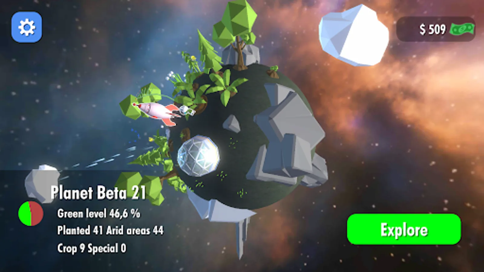 Greenify arid planets, and transform the whole environment. Walk freely on the 3D worlds, prepare the soil, select the seeds, and plant a new world. Beautiful worlds are waiting for you. All the pleasure of seeing your plants, your crops, growing and a planet transforming in a new habitable world.