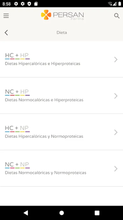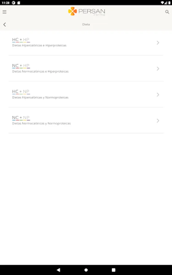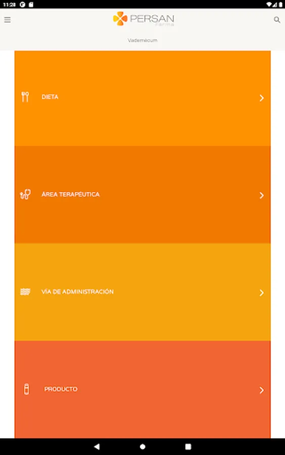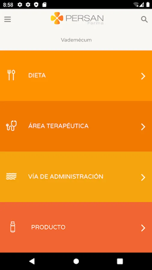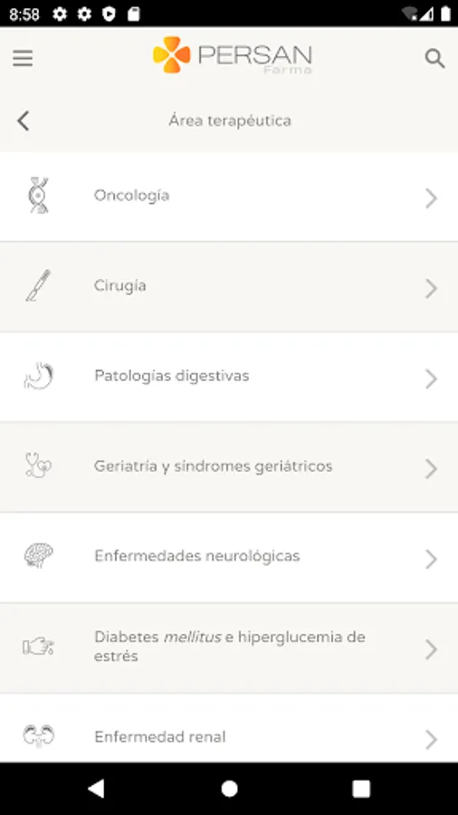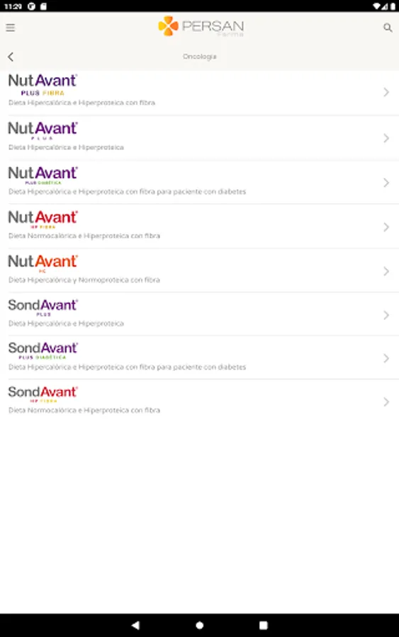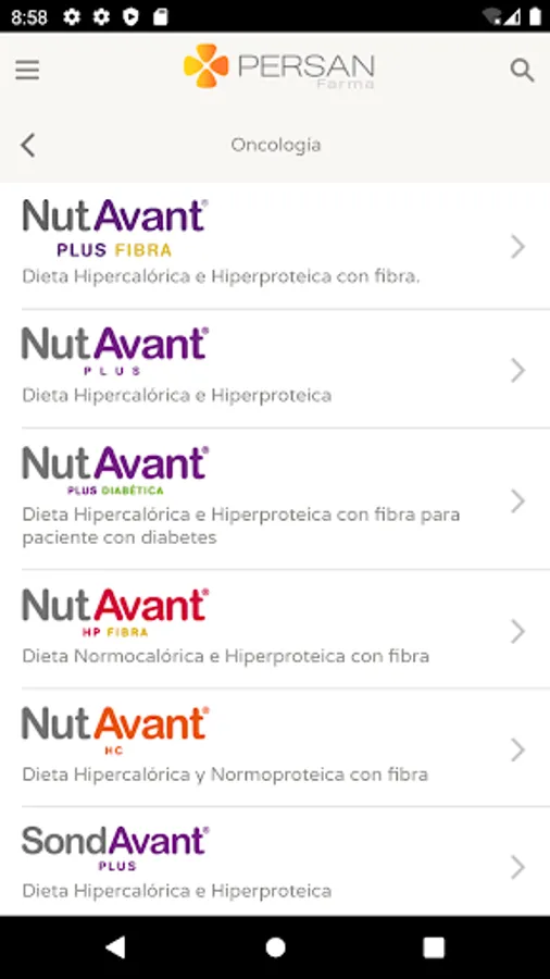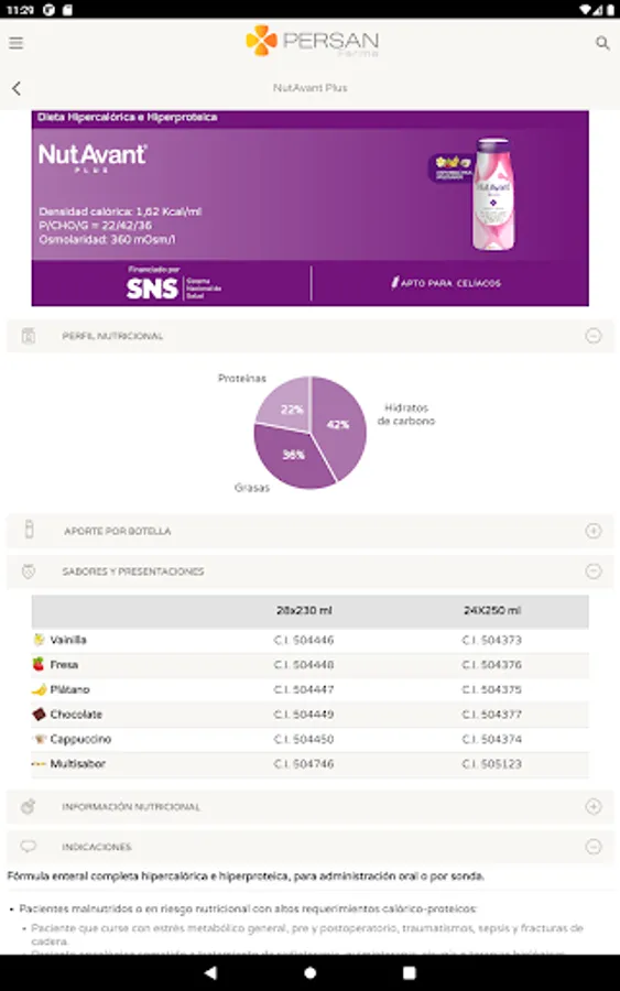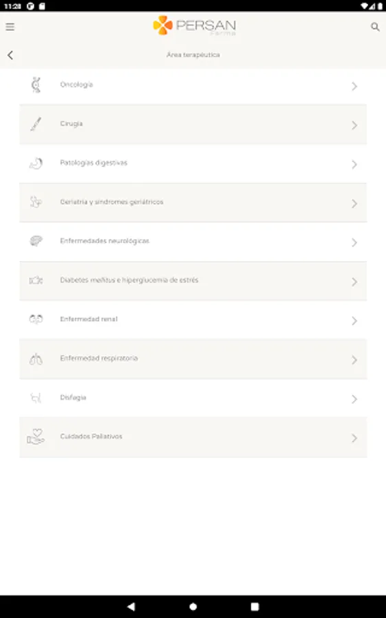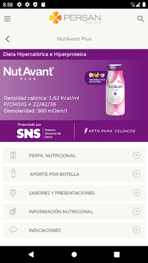 The Vademécum app by Persan Farma includes information on its line of oral enteral nutrition and its line of enteral nutrition by tube, as well as a list of therapeutic areas in relation to the type of nutritional support recommended for the patient.