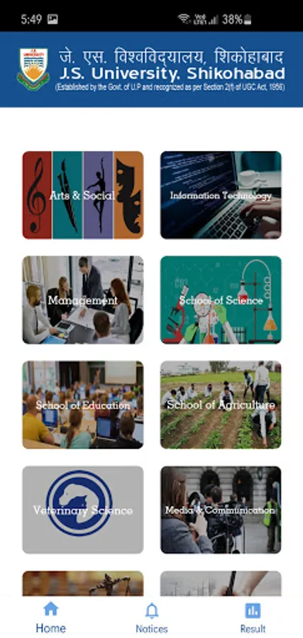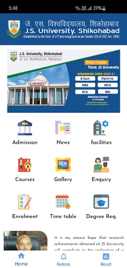 The State Government under the leadership of Shri Akhilesh Yadav, the Honorable Chief Minister of Uttar Pradesh took cognizance and introduced a Bill to the status of a University in March 2015 and christened it as JS University, Shikohabad, Firozabad. Honble Chief Minister proposed, “With a view to encourage infusion of philanthropic capital in private sector to participate in the field of higher education and encourage competition to attract high quality faculty and students and continuously enhance quality it has been decided to establish and incorporate a teaching University by the name of JS University, Shikohabad, Firozabad by Shri Jagdish Jan Kalyan Educational Trust, Shikohabad, Firozabad..” We are working hard for this noble purpose. Our motto is (Progess through proper application of knowledge).