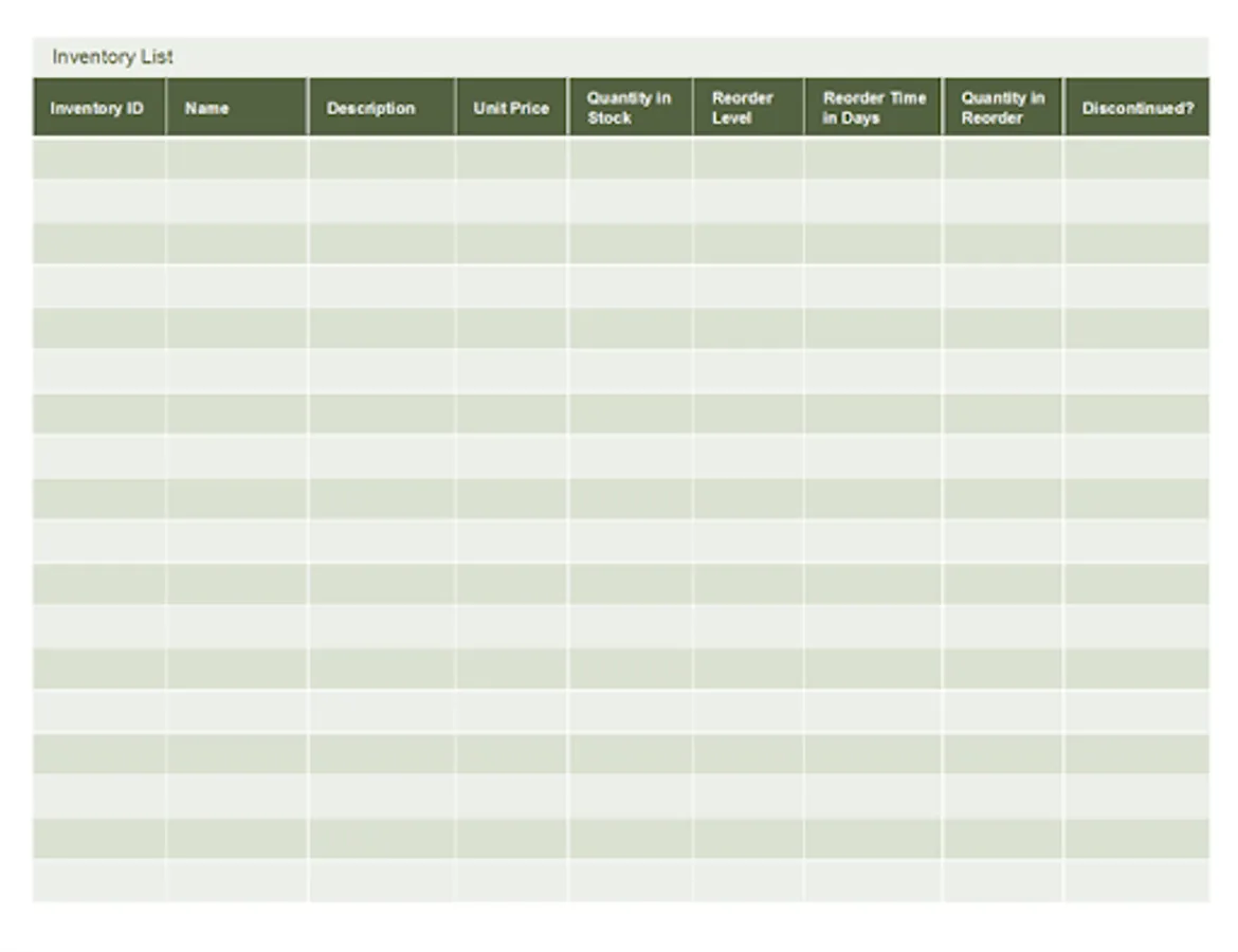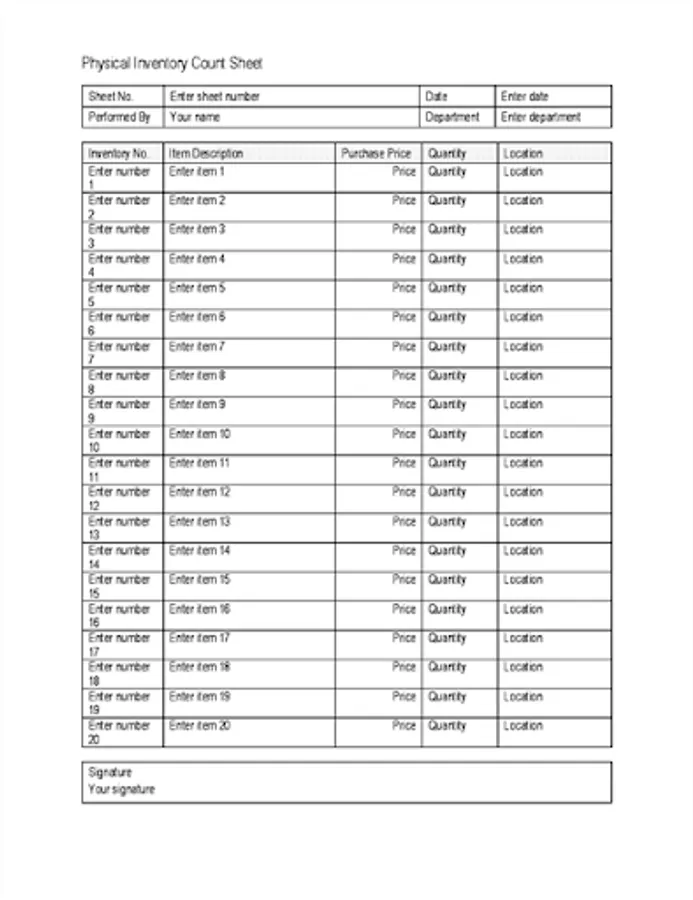 Inventory sheets, An inventory sheet takes on many different meanings for each type of business. Regardless of business type, an inventory sheet is a checklist of inventory type, amount you have, price per unit, and SKU or serial number