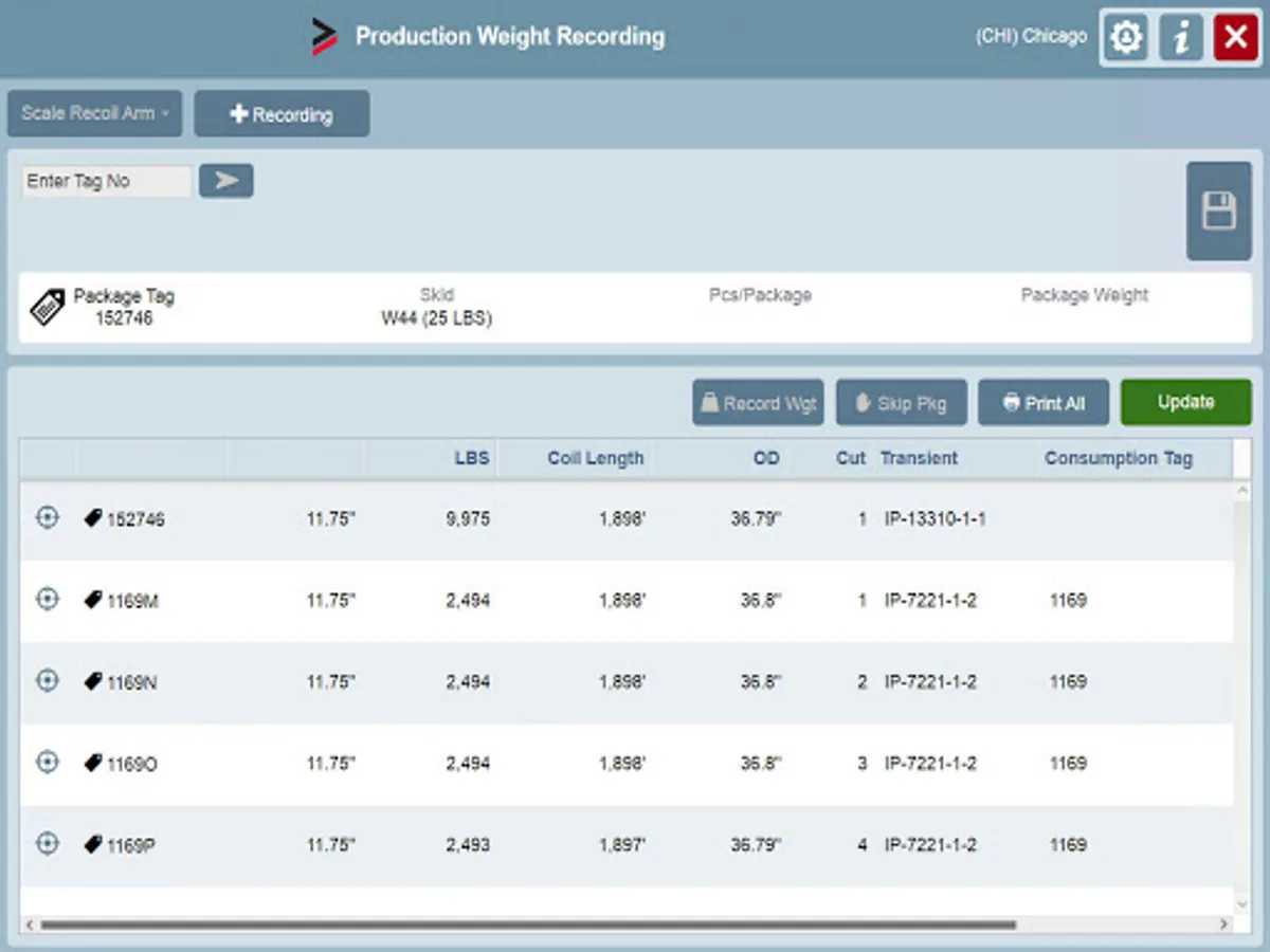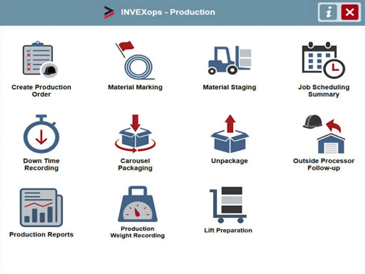 The INVEX-OPS tablet apps are designed from the ground-up to work on standard size tablets, with larger interface buttons and fonts, and a streamlined look to make them easier to use and learn. These new apps include receiving, flat-rolled production and packaging functions, lift creation to package finished goods, down-time recording, and more, all with full bar code scanning integration.