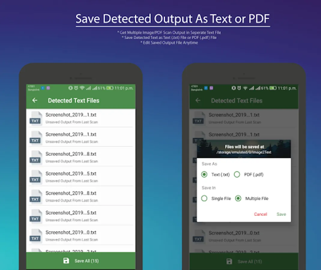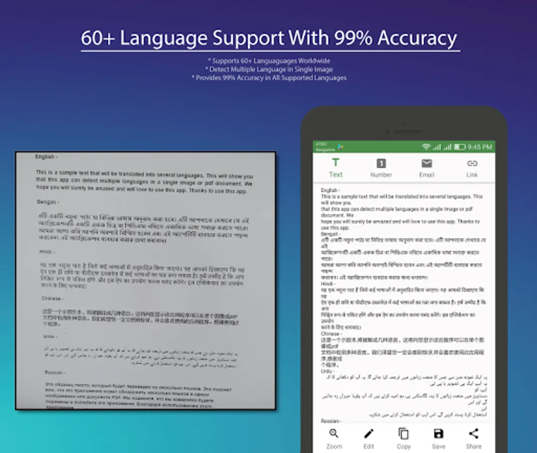 Most accurate OCR scanner app with 99%+ accuracy(Pro) and supporting most popular 60+ languages(Pro) in the world. Scans both Multiple image and PDF files and saves as single/multiple Text or PDF file.