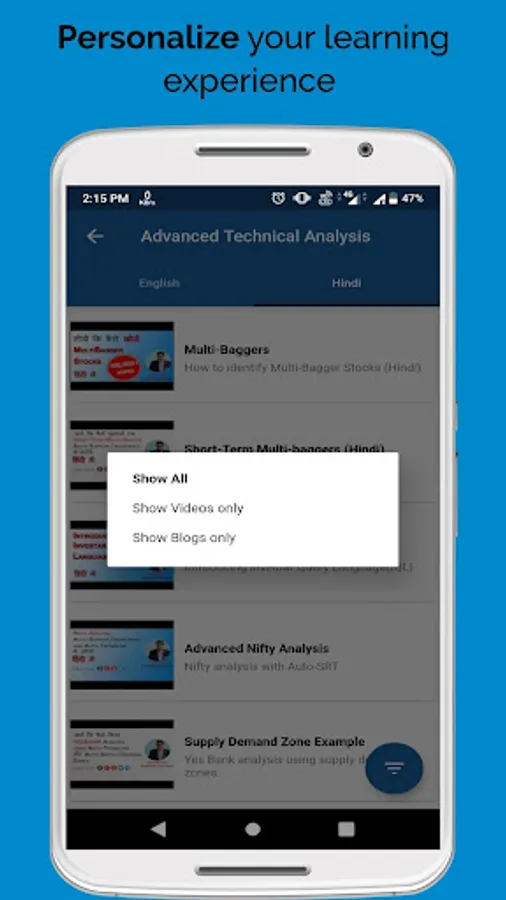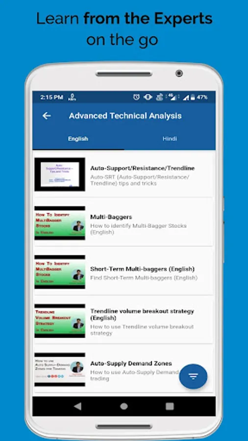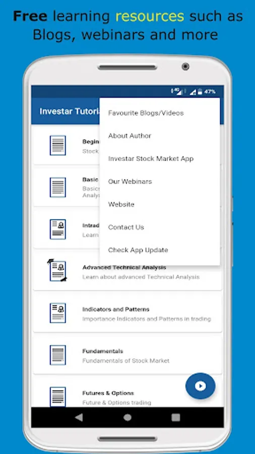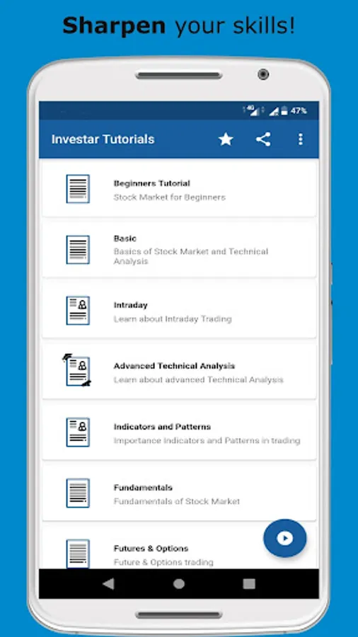 InvestarIndia has come up with a Stock market Technical & Fundamentals analysis training app which includes InvestarIndia Blogs and Videos (Hindi/English).