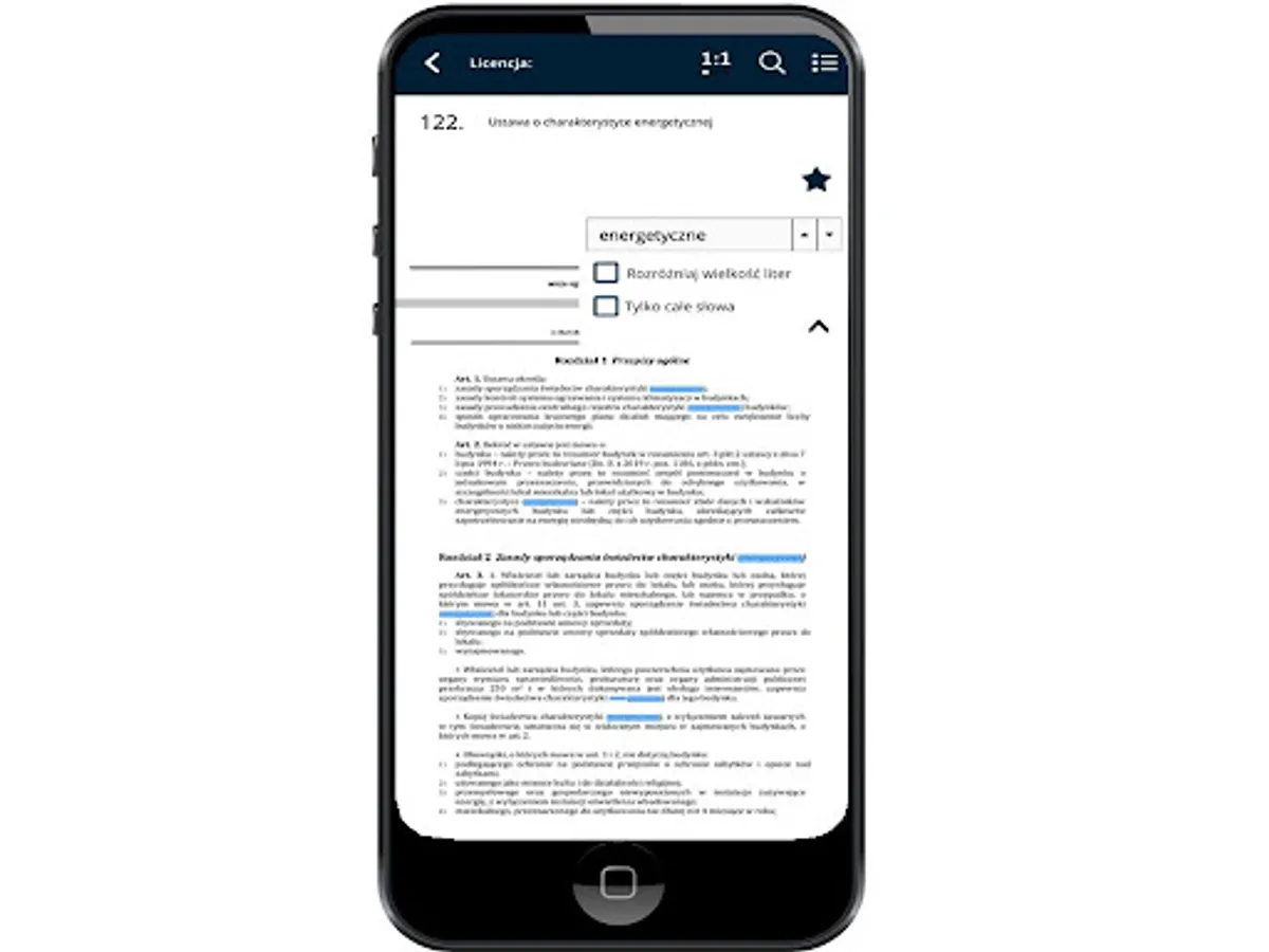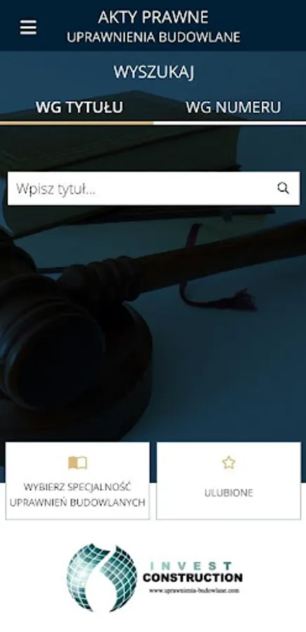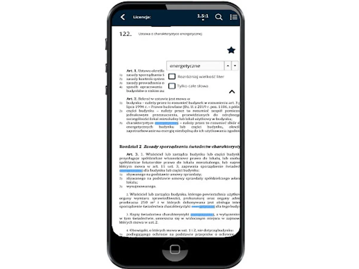 The application divides legal acts in accordance with the lists of the Chambers of Engineers and Architects. Certain laws and regulations are assigned to each of the specialties. By choosing a specific specialty, you will have access to only those acts that you need. If any acts are particularly important to you, you can add them to the "favorites" pool. This pool is available in the main menu, so you can find the act by pressing one key. In addition, each of the acts can be found by name or by serial number in accordance with the list published by the Chamber of Engineers. To make the use of the application even easier, we have made it easier to navigate through the files. You can easily jump to the selected headline, enlarge or reduce the content of the act or search for specific keywords.