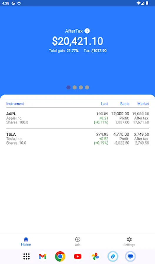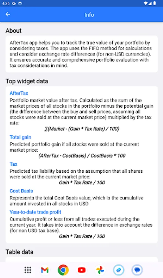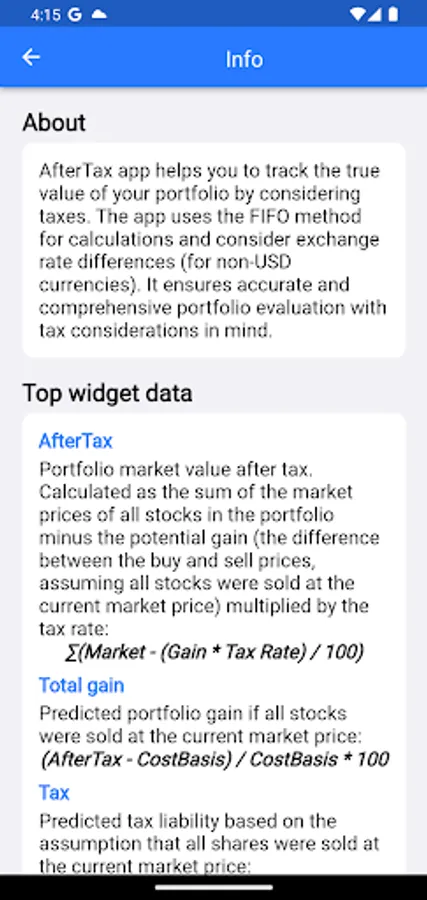 AfterTax app helps you to track the true value of your portfolio by considering taxes. The app uses the FIFO method for calculations and consider exchange rate differences (for non-USD currencies). It ensures accurate and comprehensive portfolio evaluation with tax considerations in mind.