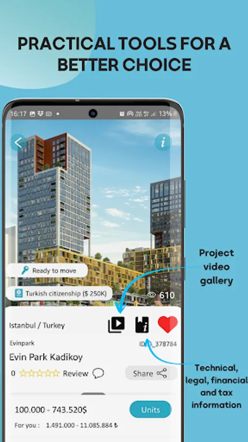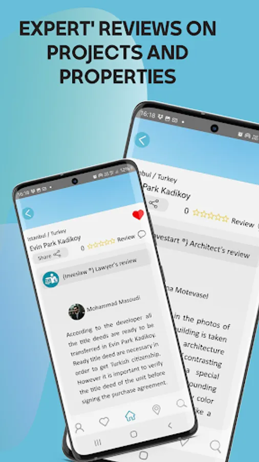 For a better decision making, we have included the opinions of lawyers and architects regarding each project and sub-units. Also, the immigration information box in each project will help you to know more about the general facts regarding immigration to your desired country.