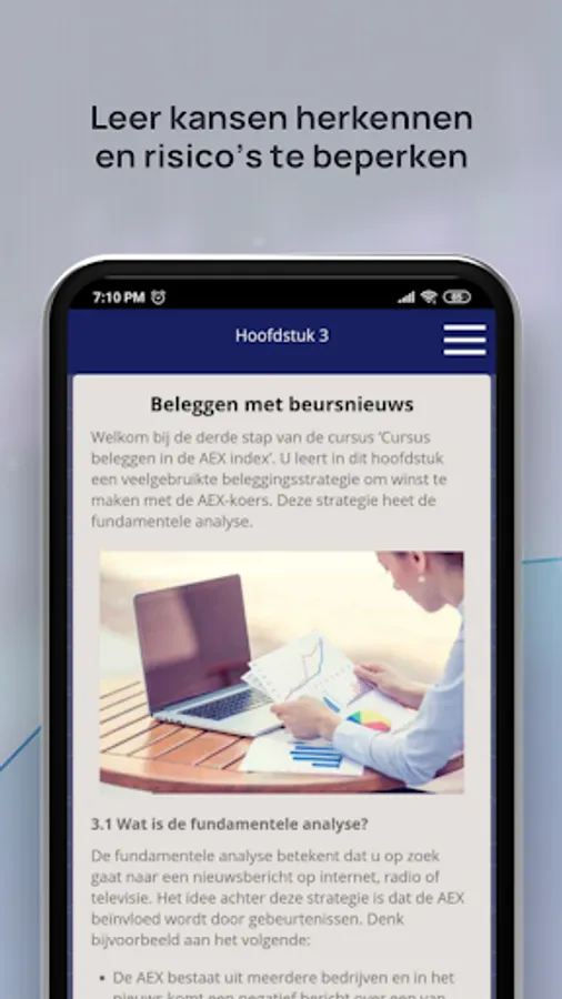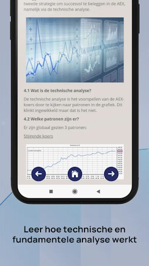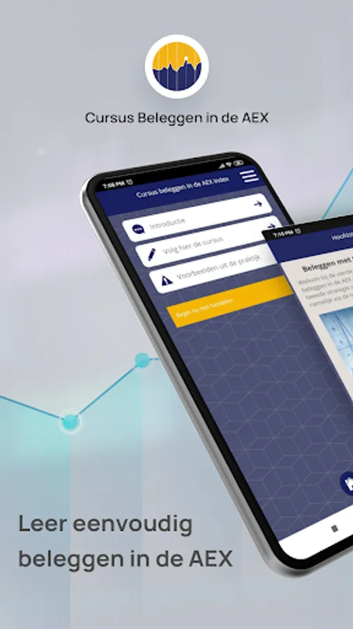 Disclaimer: this investing course in the AEX app describes how you can invest with Contracts For Differences. This is a way of investing where you use leverage. Thanks to the lever, you can trade with more volume. CFD investing has advantages and disadvantages. Trading with CFDs, just like any form of investing, is risky. That is primarily because you can lose money when the market turns against you. In addition, CFDs are leveraged products, which means that profits and losses can go fast. You can still manage the risks with CFDs. This app is not the official app of the AEX index. In this app you learn no golden method of earning money and offers no guarantee to always make a return when you invest, but you learn how investing in CFDs works by trading on the AEX course.