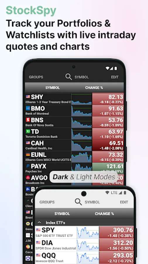 ✔ Sortable symbol lists: Sort by ticker symbol or stock price percentage change.