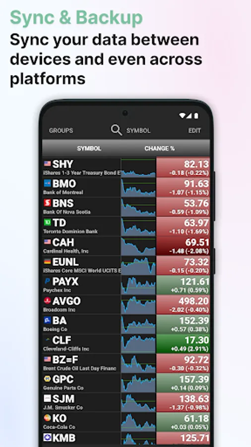 ✔ Symbol Groups: Custom named watchlists to help organize the stocks in your portfolio.