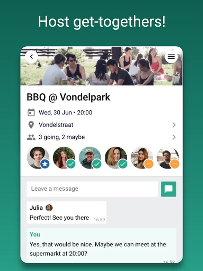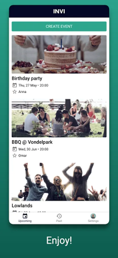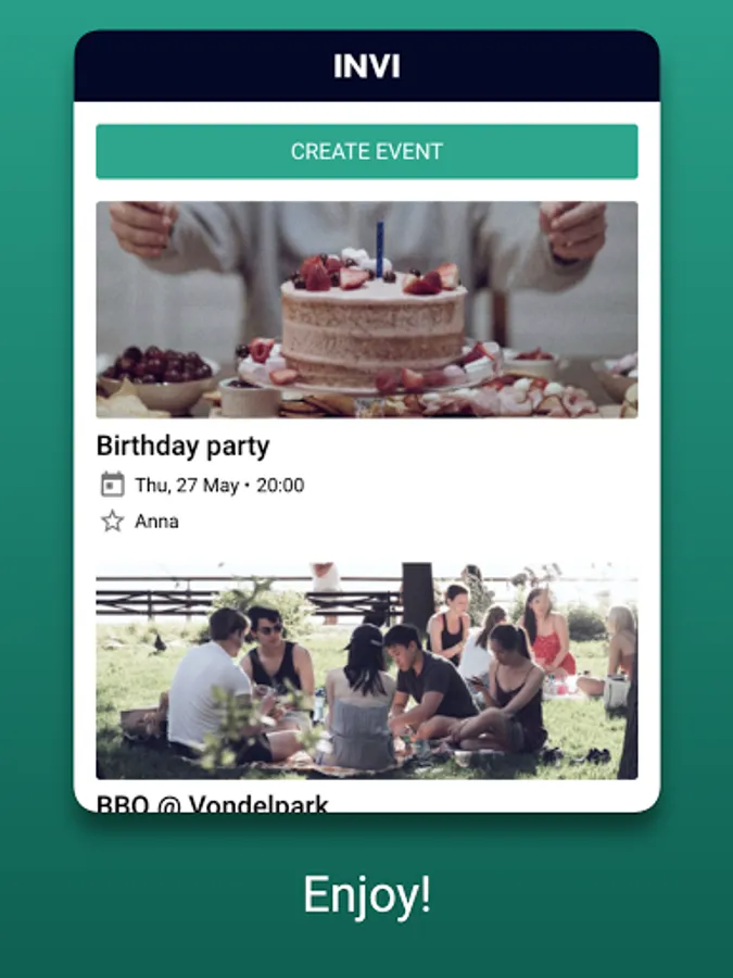 Organise your event via the Invi app, share with your friends via multiple channels with automatic calendar integration.