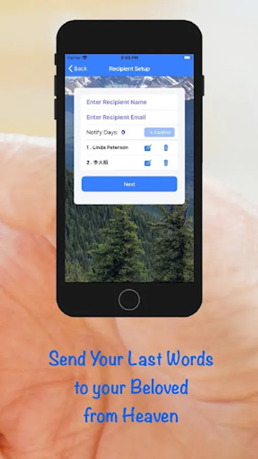 • Send the last words (video/voice/text) and say “Good Bye!” to loved ones, friends or anyone at a pre-set schedule after the user passed away.