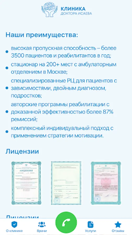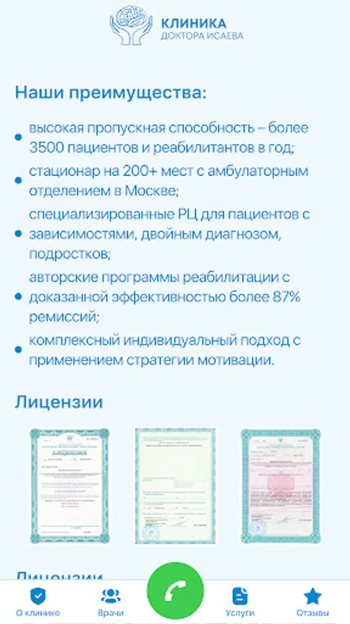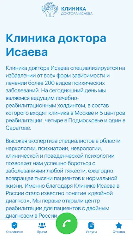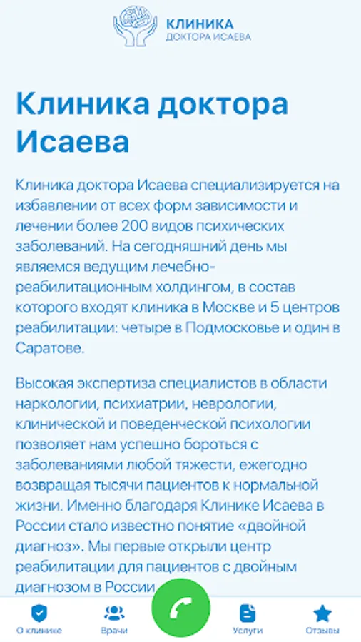 Dr. Isaev's clinic has been operating since 2007, specializing in the treatment of more than 200 types of mental illness, drug, alcohol and other addictions. Today we are the leading medical and rehabilitation holding, which includes a clinic in Moscow and 5 rehabilitation centers: four in the Moscow region and one in Saratov.