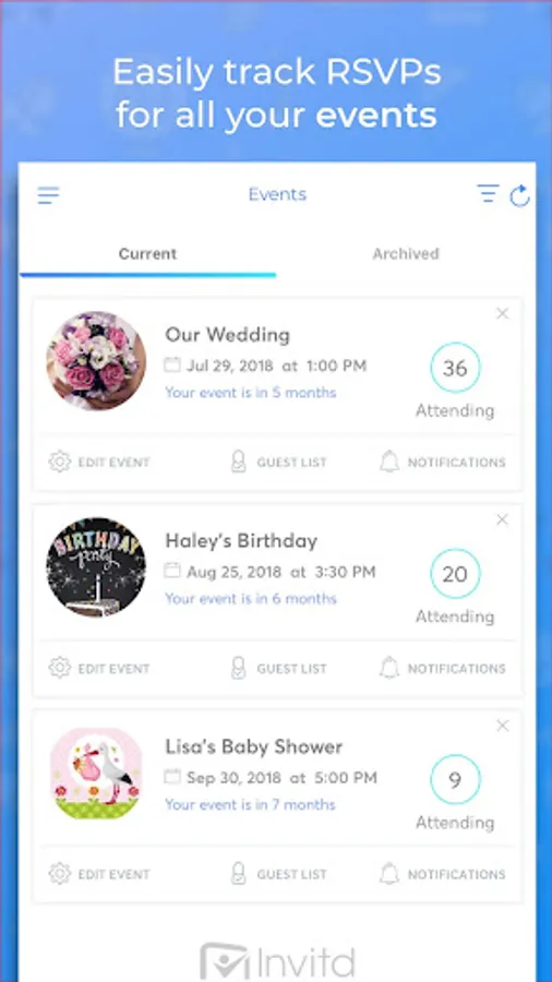 As the event organizer, party planner or wedding planner you will be able to track opened invites, RSVPs, and number of guests attending directly within the app.