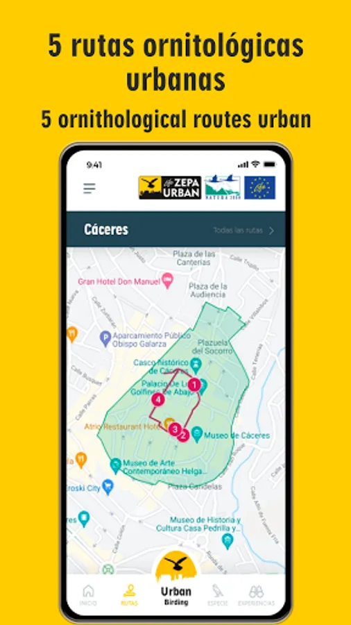 URBAN BIRDING is the name of the tourist product that has been created in Extremadura around the lesser kestrel. It groups together different companies in the region: specialized guides, activity, accommodation and restaurant companies, art studios, etc. Through them, URBAN BIRDING brings together a wide variety of tourist experiences, which allow travelers to enjoy and observe lesser kestrels in their urban habitats and areas of influence, combining the historical-artistic heritage, nature, and the quality of gastronomic products from Extremadura.