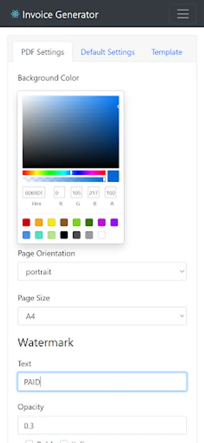 - PDF with many feature like watermark effect, page size (13 types), page orientation (portrait and landspace), background color