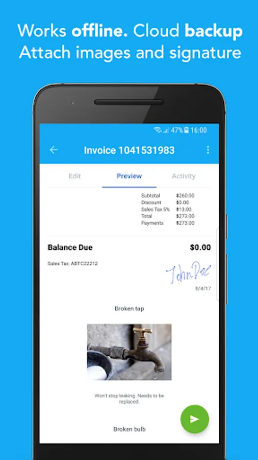 We know that mobile data is not always reliable and often expensive, You can add new customers and create invoices and estimates while you are offline. Once you are connected to the internet, we make sure all your data is backed up to the cloud.