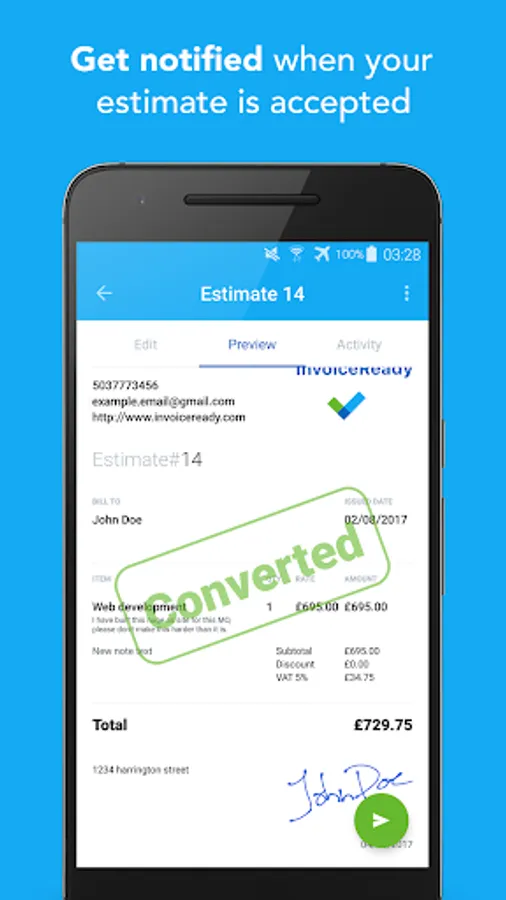 You can print your invoices or estimates using cloud print or share them using WhatsApp, Skype and other messaging apps. You can share the invoice as a link, which allows you to track when it's opened, or share it directly as a PDF.