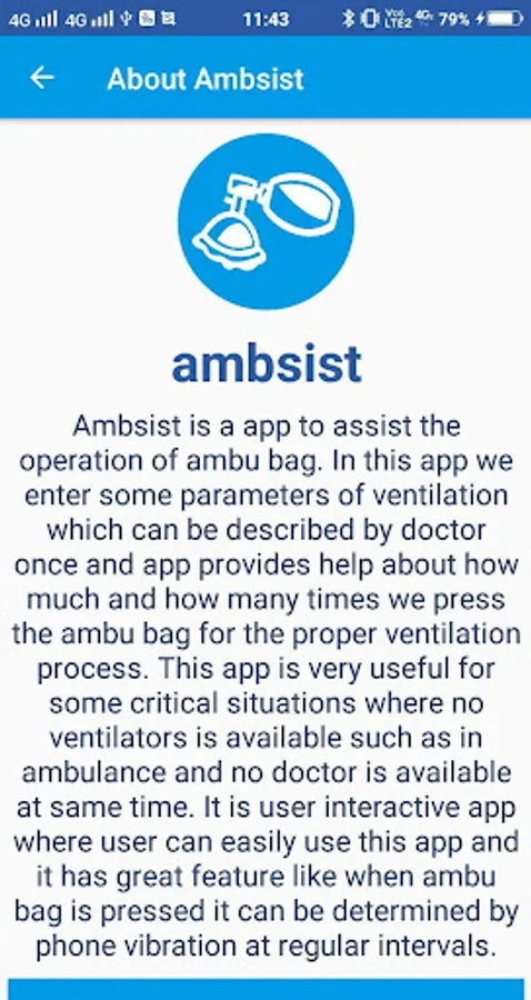 Ambsist is a app to assist the operation of ambu bag. In this app we enter some parameters of ventilation which can be described by doctor once and app provides help about how much and how many times we press the ambu bag for the proper ventilation process. This app is very useful for some critical situations where no ventilators is available such as in ambulance and no doctor is available at same time. It is user interactive app where user can easily use this app and it has great feature like when ambu bag is pressed it can be determined by phone vibration at regular intervals.