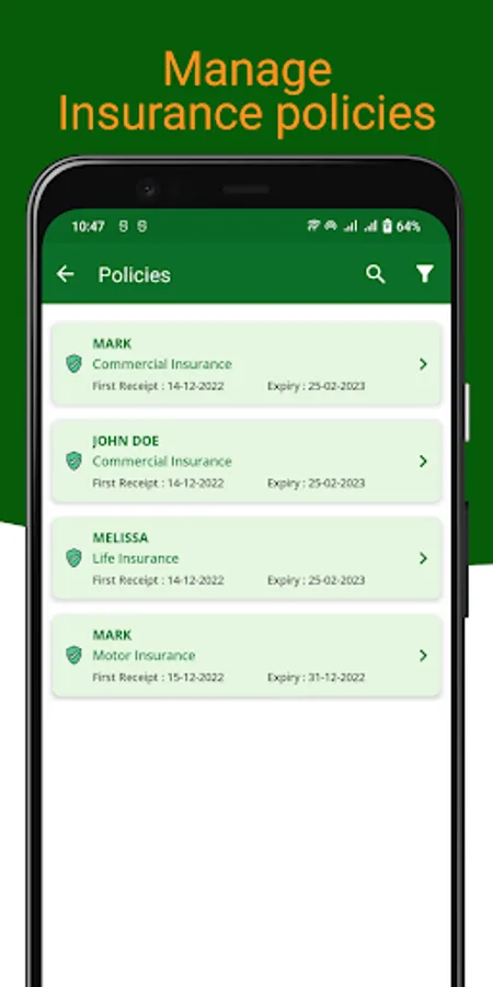 Various policy types like Commercial Insurance, Health Insurance, Life Insurance etc. can be selected from the dropdown.