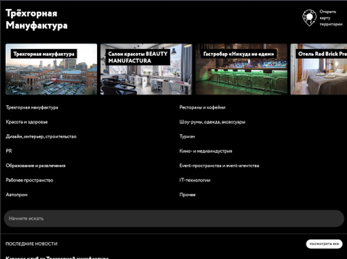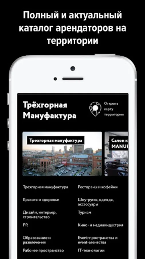 In the application, you can find a complete and current catalog of tenants in the territory of the Three-Mountain Manufactory - a multifunctional business space in the very heart of Moscow.