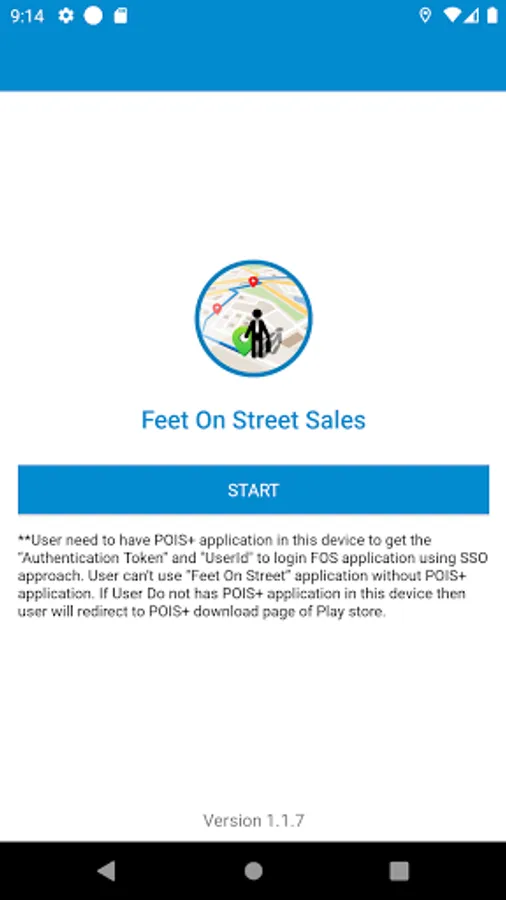 When FOS Sales application download first time from Google Play Store and opened then FOS Sales need authentication “Token” which can only available when user come on FOS Sales application via POIS+ application so when user will click on start button on launch screen FOS Sales check authentication “TOKEN” and POIS+ application if both are not available then user will redirect to POIS+ application download page on Google Play Store.