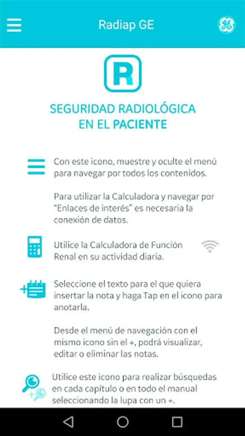 RadiappGE is an App aimed at radiologists, radiology technicians and nursing professionals that allows access to information related to radiological safety in a simple, fast and efficient way, facilitating decision making regarding their patients.