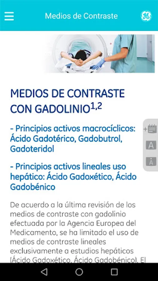 In RadiappGE you will find detailed information on: preventive measures according to the type of patient, management of adverse reactions, properties and classification of CM, optimization of the use of contrast in CT, Radiological Protection, management of the pediatric patient or lactation and pregnancy, in addition to Solutions GE Healthcare