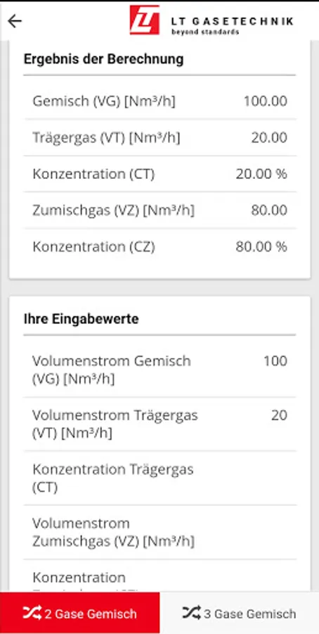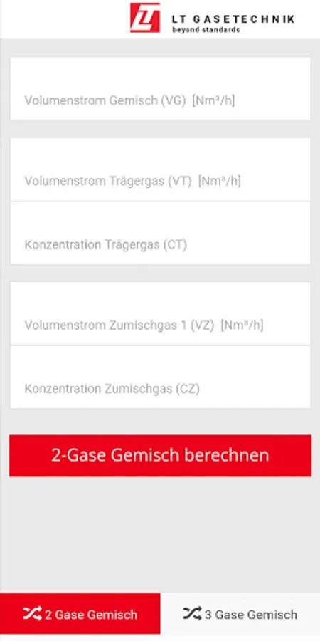 LT GASETECHNIK (früher L+T, Ludewig + Tillmann) stellt diese App kostenlos zur Verfügung. Sie dient der Unterstützung bei der Einstellung des Gasgemischs bei LT Gasmischern, um Volumenströme und Prozentsätze bei zwei oder drei Gasen zu berechnen. Bei Gasmischern für zwei Gase müssen lediglich zwei von fünf möglichen Werten (Gesamtmenge, Trägergasmenge, Trägergasanteil, Zumischgasmenge, Zumischgasanteil) angegeben werden. Bei drei Gasen sind es entsprechend mindestens drei Werte. Nach Klick auf die Schaltfläche "Gemisch berechnen", werden die Ergebnisse angezeigt und darunter die vorher vom Benutzer eingegebenen Werte. Somit kann der Volumenstrom direkt abgelesen und an den Dosierventilen präzise eingestellt werden und die gewünschte Gasmischung wird präzise und nachvollziehbar erzeugt.