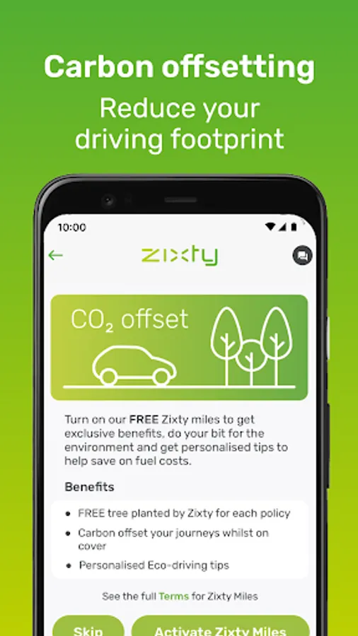With Zixty Miles, we’ll also provide expert feedback about your driving style, helping you save money, drive more safely, and reduce your CO2 emissions. That’s good for you, and great for the planet.