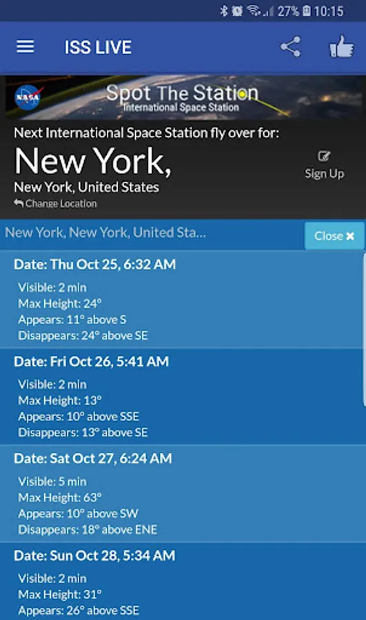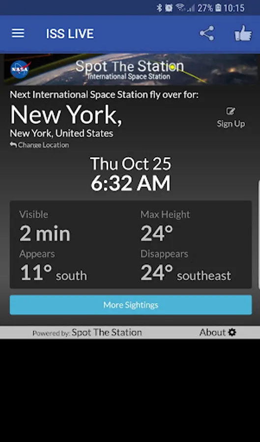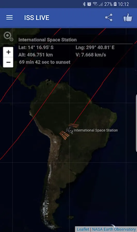 The application has an integrated (ISS tracker), where you can follow the orbit of the ISS around our planet, zoom, rotate, drag and tilt the map, and a window of information that presents with data such as speed ISS, altitude, visibility, country over which ISS is now, latitude and longitude.