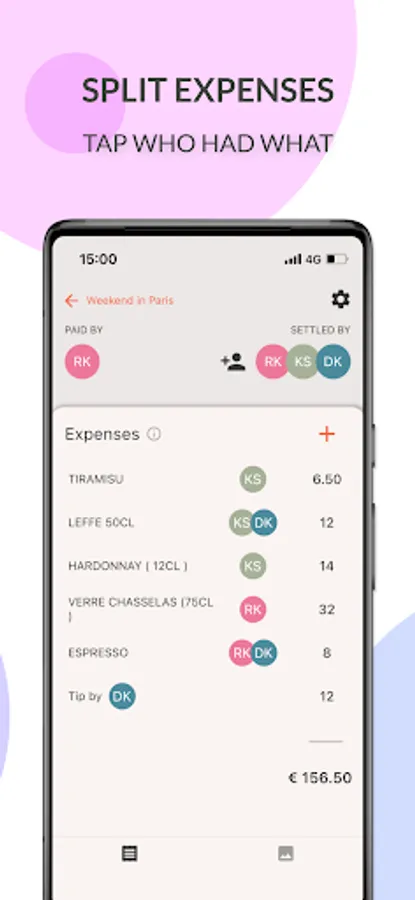 • Include tips and additional expenses – Add the tip amounts and watch the totals change automatically. Without the need to work out percentages!