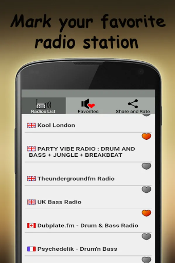 When you identify Drum n Bass radio stations that you like, you can mark them as favorite to access them easily whenever you like.